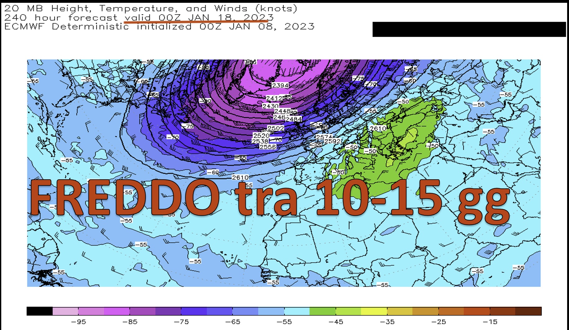 Da circa 10 giorni abbiamo per primi richiamato l’attenzione sul VPS perché la sua evoluzione promette appunto l’arrivo di aria polare. Infatti, da pochi giorni è iniziata un’invasione del circolo polare, sulla parte opposta a quella europea, da parte dall’anticiclone del Pacifico, che è notoriamente caldo a tutte le quote. L’incursione è resa evidente appunto dal surriscaldamento della Stratosfera (StratWarming) al di sopra del circolo polare là dove si è appunto incuneato l’anticiclone del Pacifico. Questo cuneo di alta pressione sta sospingendo il VP verso il meridiano apposto all’anticiclone del Pacifico, ossia verso l’Europa. Pertanto lo Stratwarming nel lato opposto al nostro meridiano, è il più affidabile indizio di una imminente irruzione di aria fredda alle nostre latitudini. Ebbene la figura allegata proiezione odierna del modello europeo ECMWF, mostra che in effetti che intorno al 18 gennaio si prevede che il VPS o e poi via via il VP sottostante, sotto la spinta dell’anticiclone caldo del Pacifico, raggiunga il Regno Unito. Probabili massimi effetti sull’Italia tra il 22 e 24 gennaio.