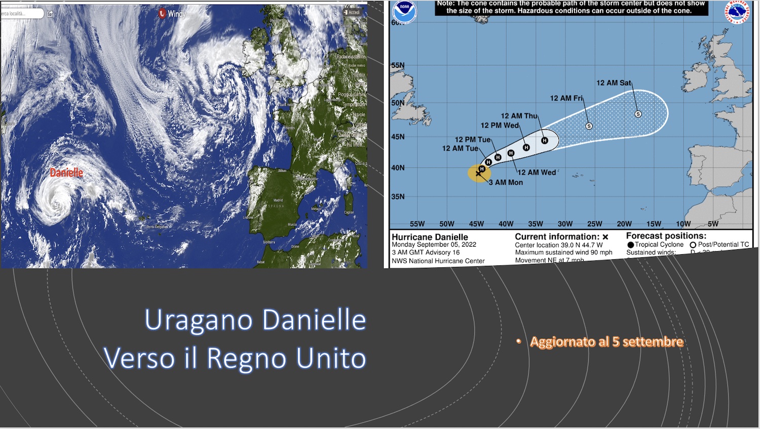 L’uragano Danielle si trova oggi, 5 settembre, posizionato molto a nord-est delle Bermuda e ad ovest delle Azzorre.