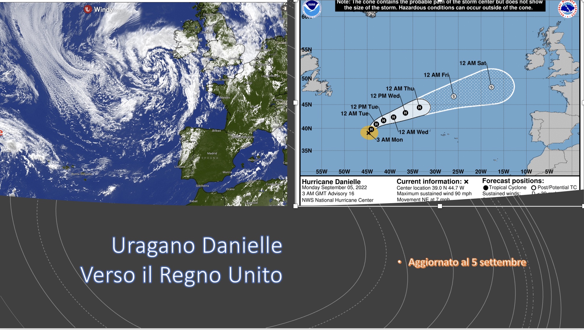 L’uragano Danielle si trova oggi, 5 settembre, posizionato molto a nord-est delle Bermuda e ad ovest delle Azzorre.