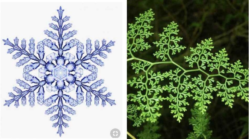 E anche la genesi del cristallo di neve avviene in modo tale lungo ognuno dei 6 rami del cristallo di neve si generano altre ramificazioni, ovviamente più piccole, ognuna delle quali, vista al microscopio, è una esatta minicopia del primitivo cristallo. A sua volta. lungo ogni ramo della minicopia, potrebbero generarsi altri cristalli mini-mini, ma sempre fotocopia di quello primitivo. In natura esistono molti altri esempio di bellezza geometrica dei frattali.