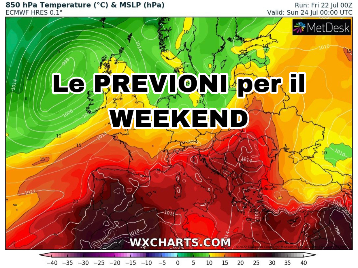 Termicamente parlando, il weekend in arrivo porterà con se un ulteriore aumento delle temperature nella giornata di Sabato. Non sono esclusi valori davvero vicini se non localmente superiori ai +40 gradi su buona parte del paese, specialmente al Centro e al Nord. La giornata di Domenica potrebbe invece presentare un paio di gradi in meno, ma sempre valori molto elevati. Ecco le anomalie termiche previste per il weekend rispetto alle medie climatiche a 850 hPa di quota: