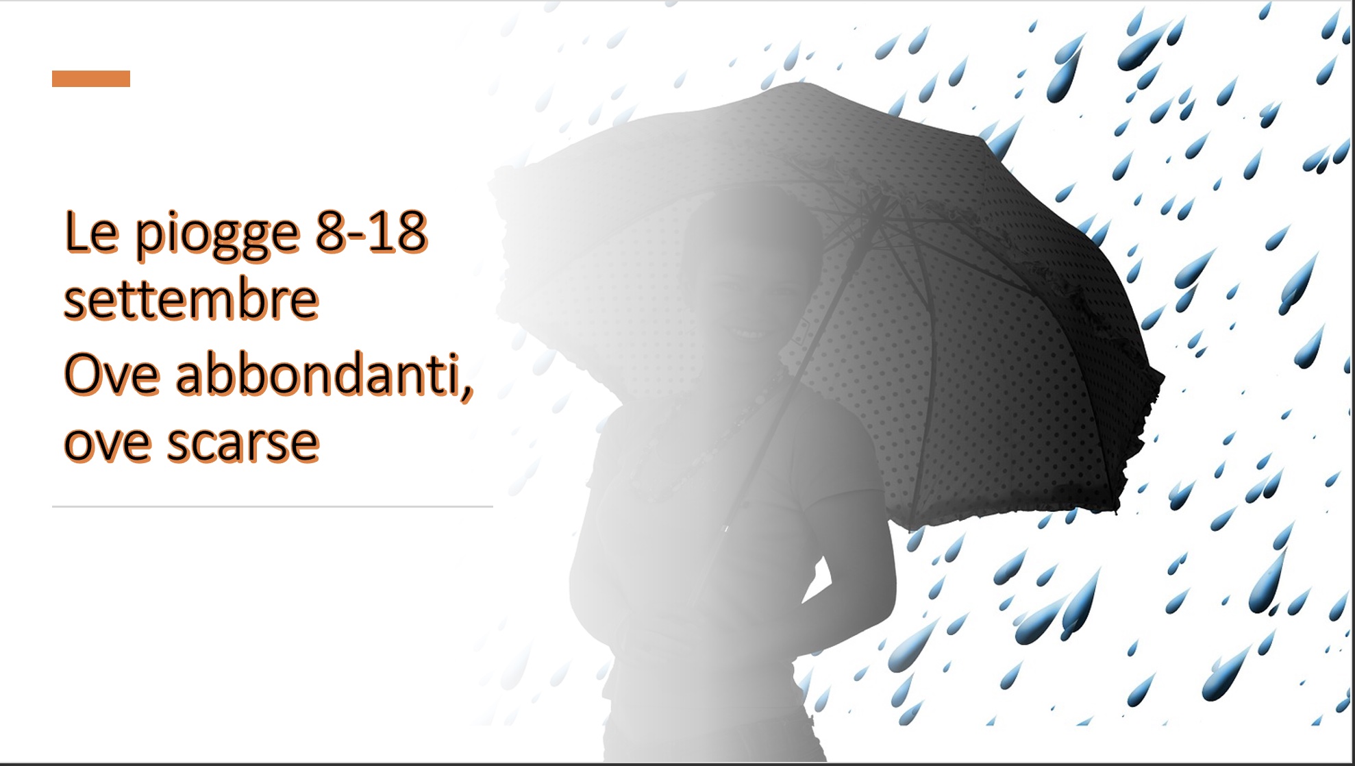 Settembre fa parte dell’autunno, la stagione più piovosa. In realtà settembre non è così piovoso come ottobre e novembre ma comunque dal punto di stia climatico la pioggia totale attesa nel mese oscilla tra 50-60mm circa sul Nord Italia e 30-35mm sul Meridione.