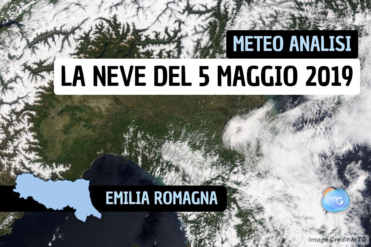 Pertanto è stata riscritta la storia meteo di questa regione in questa mitica giornata di Maggio 2019, con neve che si è spinta persino a quote prossime al livello del mare a meno di un mese dall’inizio dell’Estate meteorologica. Per concludere, vediamo gli effetti di quella pazzesca perturbazione di stampo più invernale che primaverile in questa regione: lo scatto satellitare di Lunedì 6 Maggio lascia intravedere, ma con difficoltà a causa della nuvolosità residua, gli accumuli di neve sull’Appennino Emiliano.
