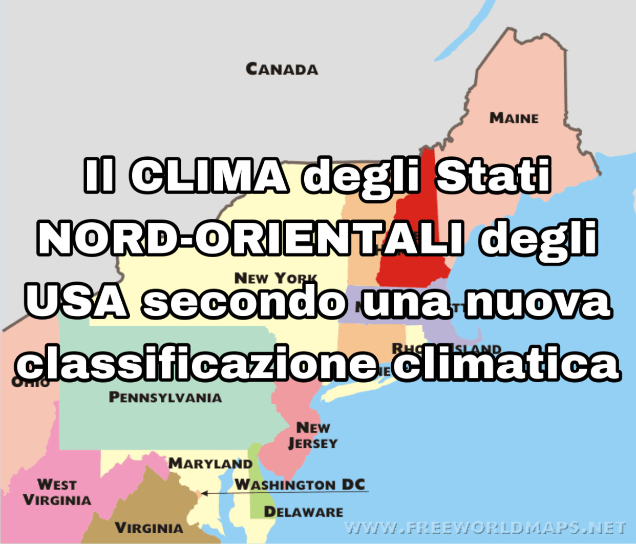 Ripartiamo dal Nord-Est stavolta: gli stati Maine, New Hampshire, Vermont, Massachusetts, Rhode Island, Connecticut, New York, New Jersey, Delaware, Pennsylvania, Maryland sono raggruppabili nella macrozona climatica del “Nord-Est” degli Stati Uniti continentali. La loro descrizione geografica l’abbiamo già vista negli articoli dei mesi scorsi, per cui procediamo subito ad analizzare il clima di questi undici stati secondo questa innovativa classificazione climatica.