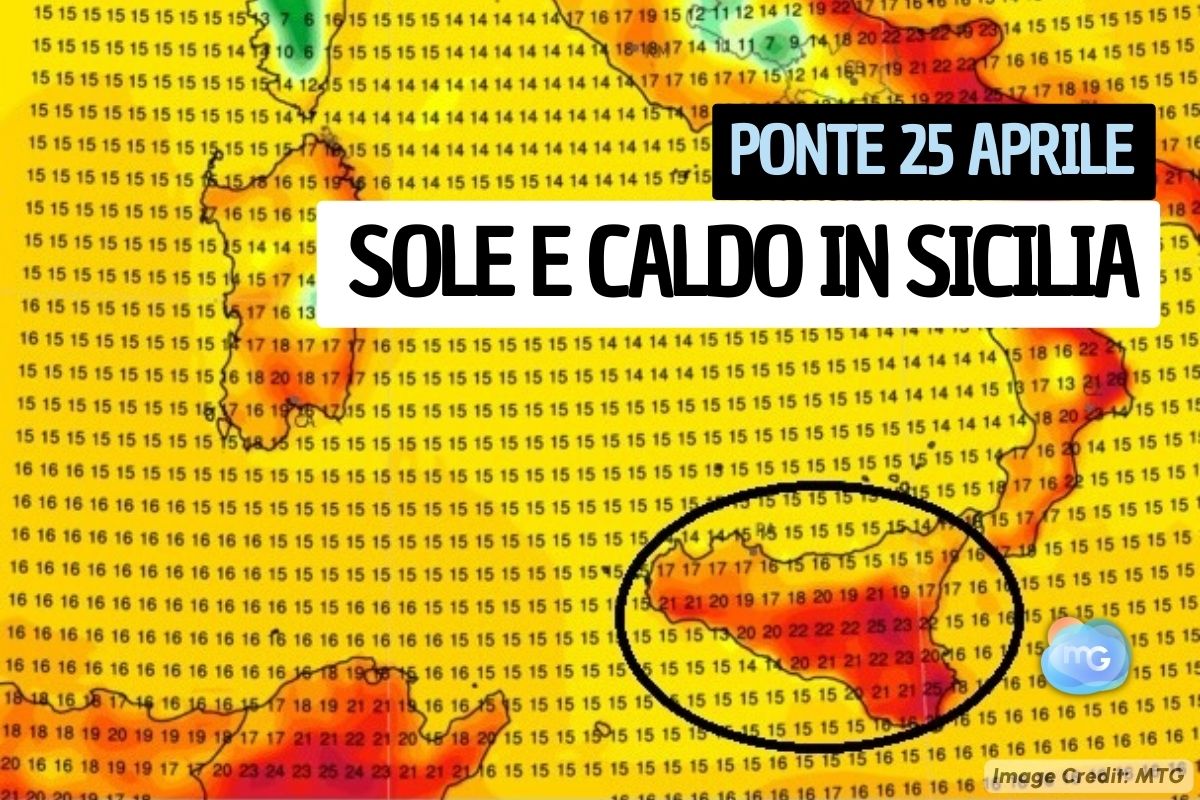 Weeken lungo festivo molto bello in arrivo in Sicilia. Infatti le giornate di Sabato 23, Domenica 24 e Lunedì 25 vedranno il sole protagonista sull'Isola, solo un temporaneo aumento delle nuvole è atteso Domenica, senza pero' particolari addensamenti. Il richiamo caldo in arrivo porterà temperature semi estive: le temperature massime aumenteranno infatti anche di 8/10 gradi rispetto alla giornata di giovedì.
