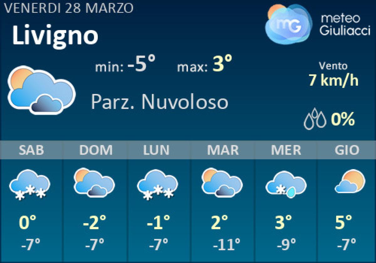 Previsioni meteo Livigno per Venerdi 28 Marzo: Giornata all'insegna della nuvolosità di passaggio, a tratti più consistente. Analizziamo in modo dettagliato: al mattino cielo sereno o poco nuvoloso, la temperatura del primo mattino sarà di -5°C; nel pomeriggio nubi sparse, in serata coperto, i valori di temperatura massimi saranno di circa 3°. Intensità dei venti debole da S al mattino, sempre debole ma da NW nella seconda parte del giorno; velocità massima del vento sui 14 km/h. L'altezza dello zero termico è prevista intorno ai 1700 metri con tendenza alla diminuzione.