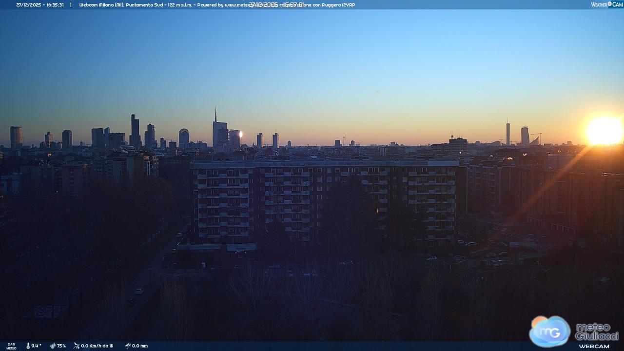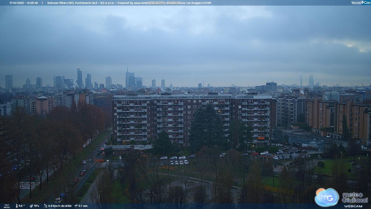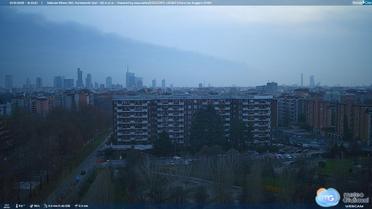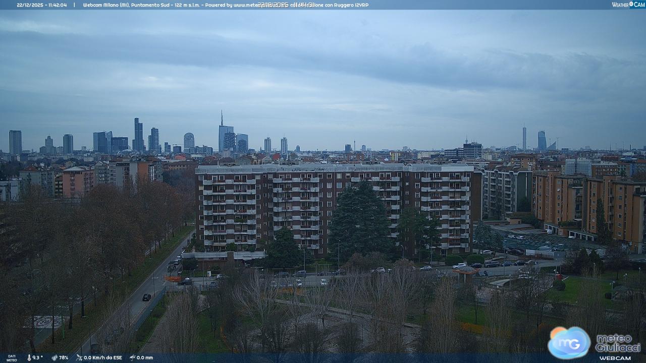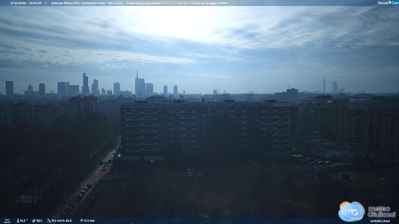 Webcam ad alta risoluzione Mobotix M26 di MeteoGiuliacci, installata nella zona Nord di Milano con ripresa verso Sud, in primo piano il centro direzionale della città, la Stazione Centrale è visibile sulla sinistra dell'immagine.