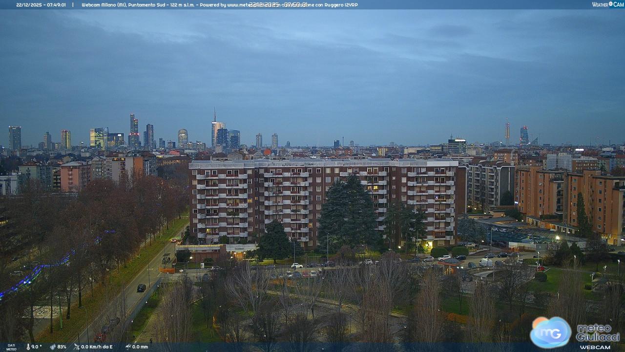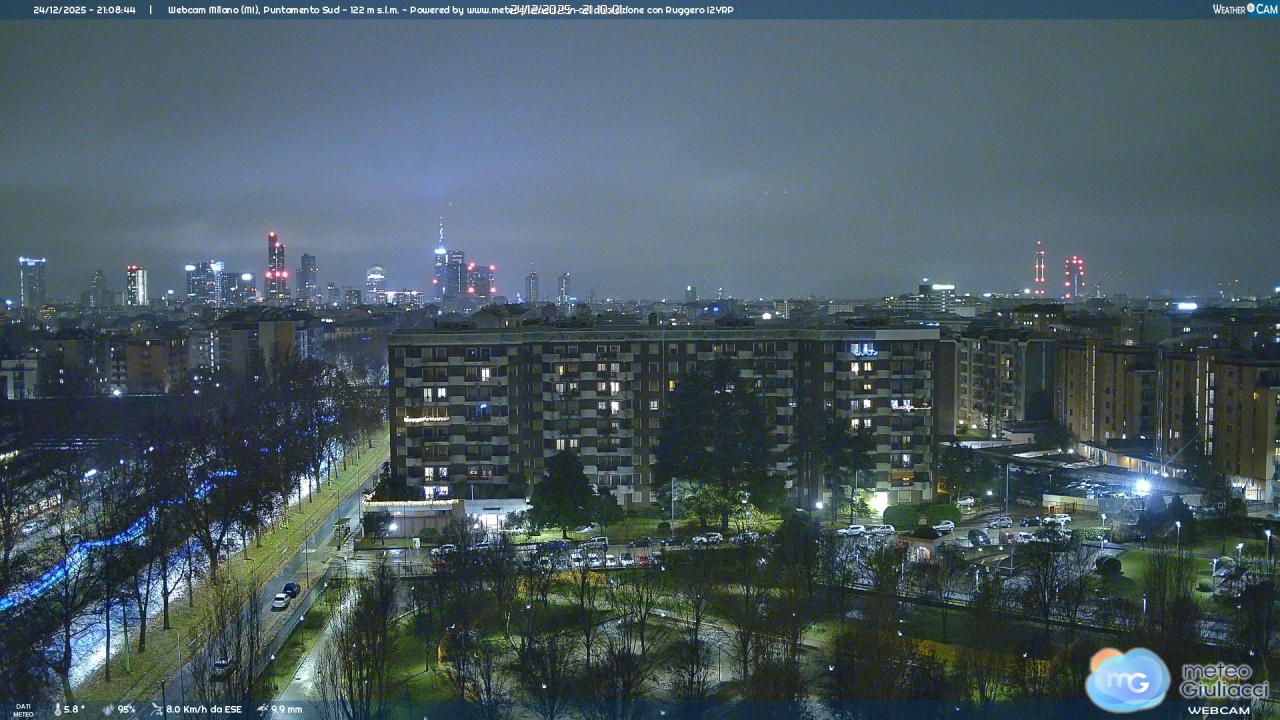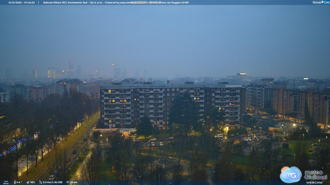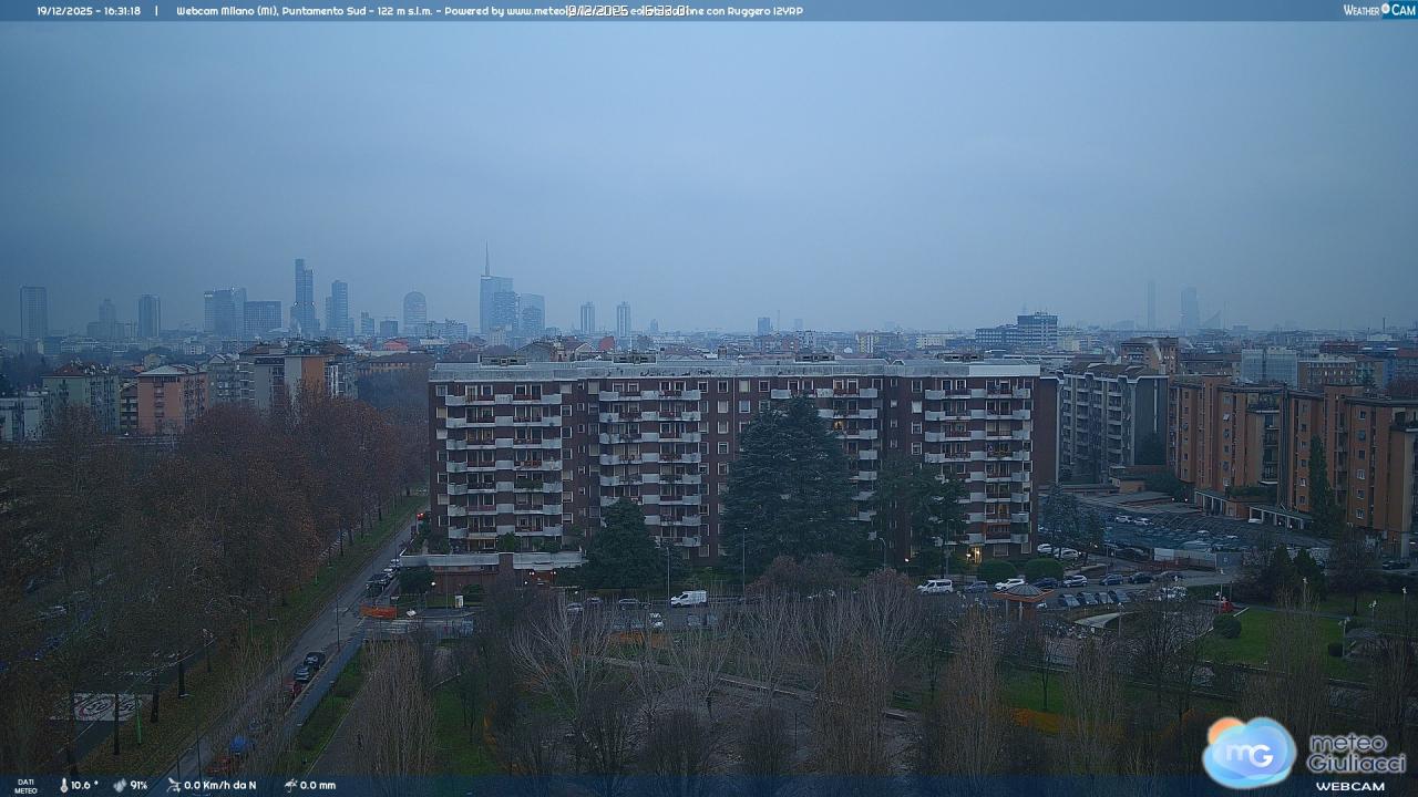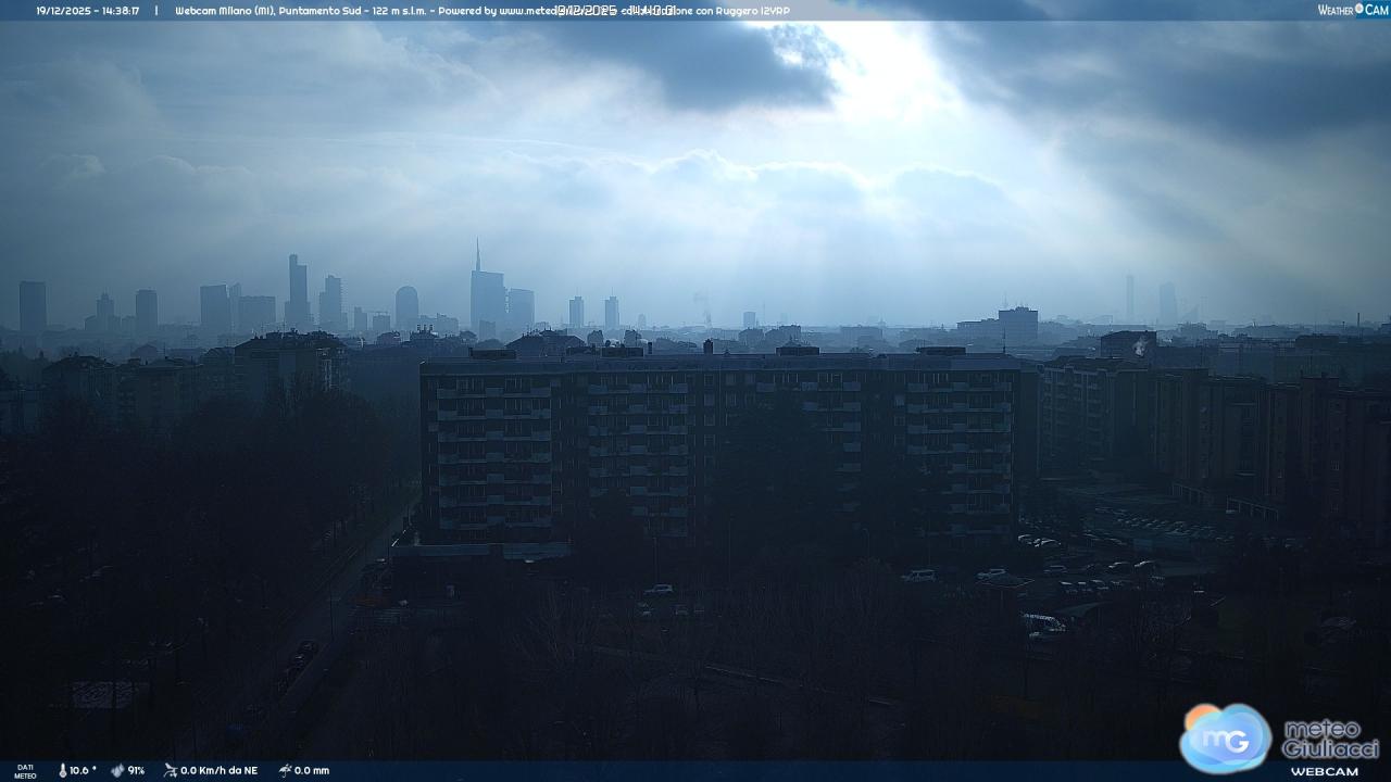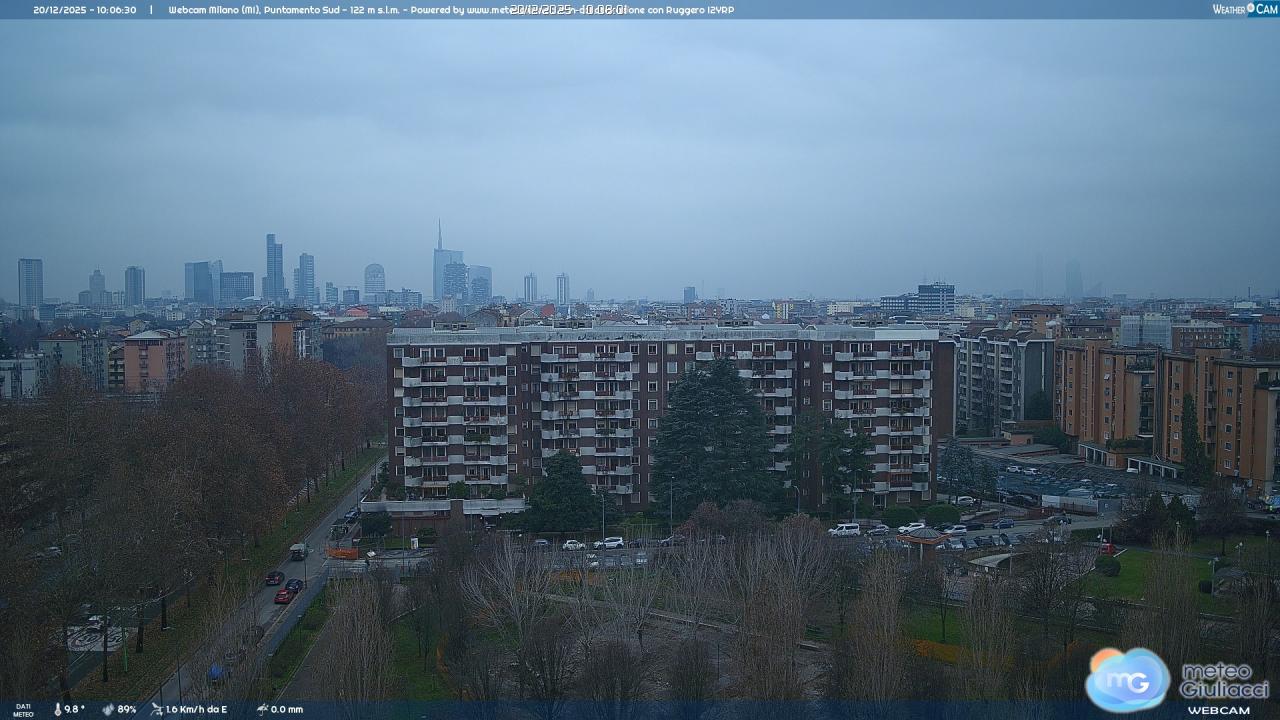 Webcam ad alta risoluzione Mobotix M26 di MeteoGiuliacci, installata nella zona Nord di Milano con ripresa verso Sud, in primo piano il centro direzionale della città, la Stazione Centrale è visibile sulla sinistra dell'immagine.