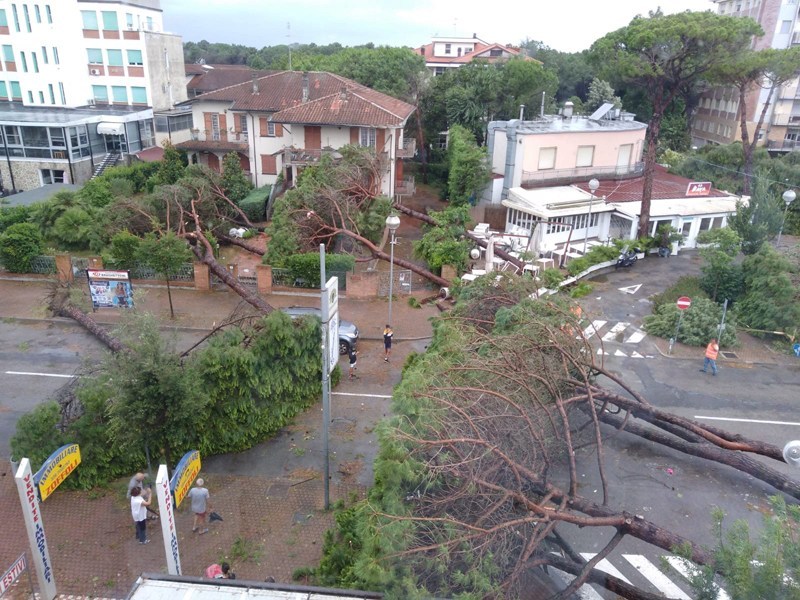 Le forti raffiche di vento hanno divelto tendoni, cartelli ma soprattutto provocato un’ecatombe di pini che hanno paralizzato il traffico. Molti di questi pini hanno schiacciato auto ed anche un autobus di linea. I pini marittimi hanno poca stabilità e rappresentano spesso un problema durante le raffiche di vento: risultano instabili soprattutto in estate quando la callosità delle radici si accentua. Il passaggio di auto ed i successivi strati di asfalto possono far esplodere le radici, causandone poi la caduta. All’arrivo di un forte temporale bisognerebbe sempre evitare di sostare sotto un albero.