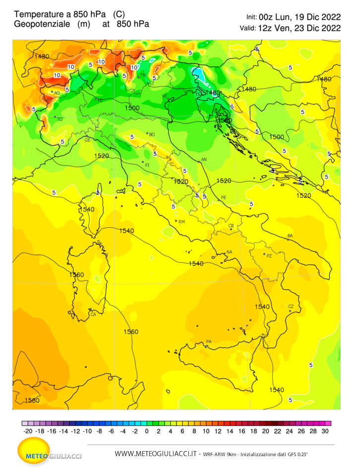 Ecco le termiche previste in quota per Venerdì, antivigilia di Natale: