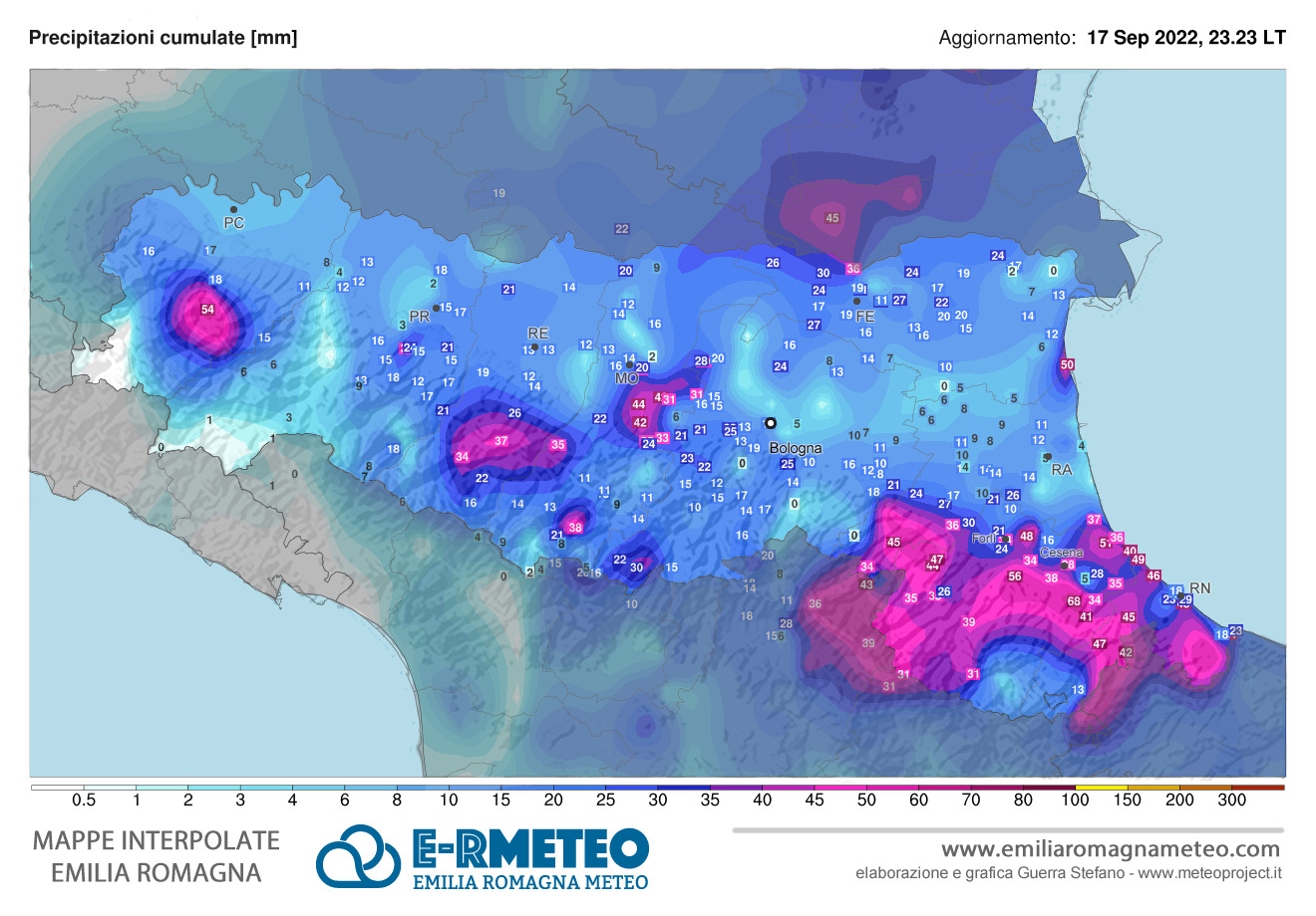Il 17 Settembre scorso la regione dell’Emilia-Romagna ha assistito a una delle ondate di freddo tardo estive/inizio autunnali più interessanti di sempre: tra la tarda notte e il primo mattino è entrata aria fredda di Bora su tutta la regione, la quale ha fatto crollare le temperature e portato precipitazioni localmente abbondanti. Precisiamo una cosa notevole: in queste zone fino a poche ore prima era in pieno corso la tipica Estate Settembrina, con giornate soleggiate, terse, calde di giorno e fresche di notte; anzi, nei giorni precedenti al 17 erano stati registrati picchi abbastanza notevoli di temperatura massima, addirittura fino a 32/33 gradi nei centri urbani della pianura, e di temperatura minima, con notti tropicali abbastanza diffuse in alcune zone.