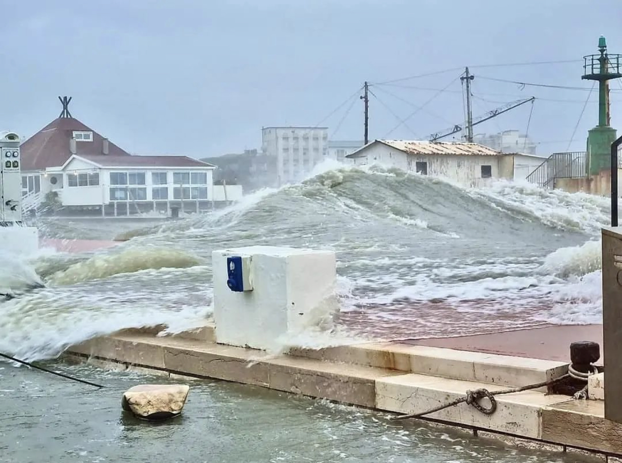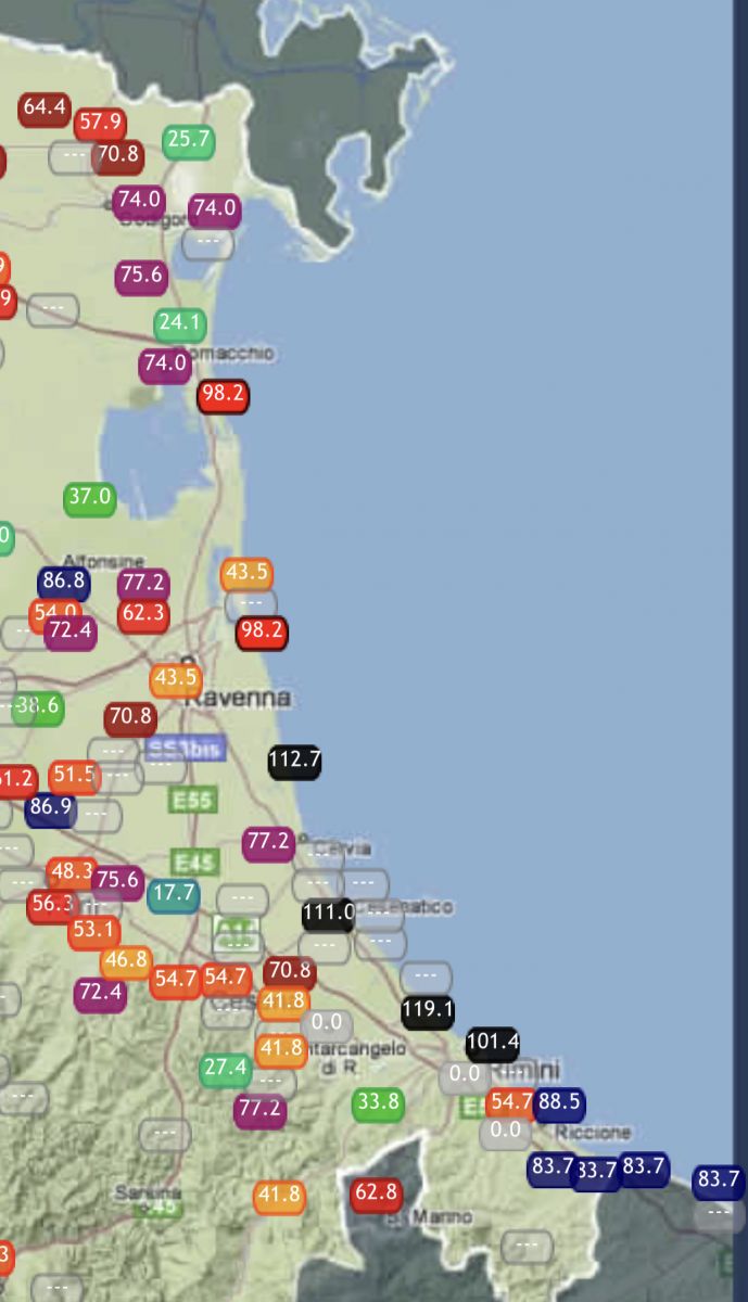 Addirittura 4 raffiche superiori ai 100 km/h si sono registrate tra Rimini e Ravenna (picco di 119.1 km/h), superiori agli 80 km/h in molte stazioni a Sud di Rimini (picco di 88.5 km/h). Ciò ha comportato mareggiate notevoli, dall’aspetto quasi esotico, Nord-Atlantico, sulle coste della Romagna, come mostra per esempio l’immagine seguente, scattata a Cervia: