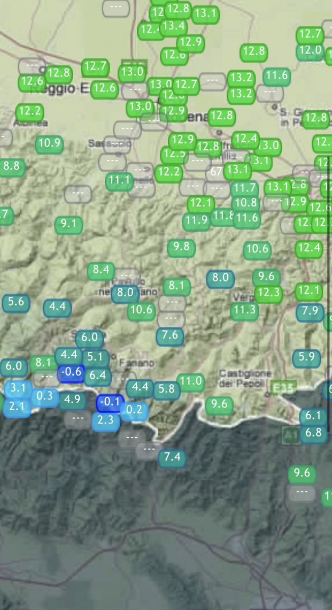 Si sono registrati anche altri eventi molto importanti: le prime temperature minime sotto i 10 gradi della stagione su buona parte del territorio e le prime gelate sull’Alto Appennino (-0.6°C sul Monte Cimone, -0.1°C a Passo Croce Arcana e -0.3°C sul Monte Cusna)!! Ecco per esempio le minime raggiunte tra Bolognese e Modenese: