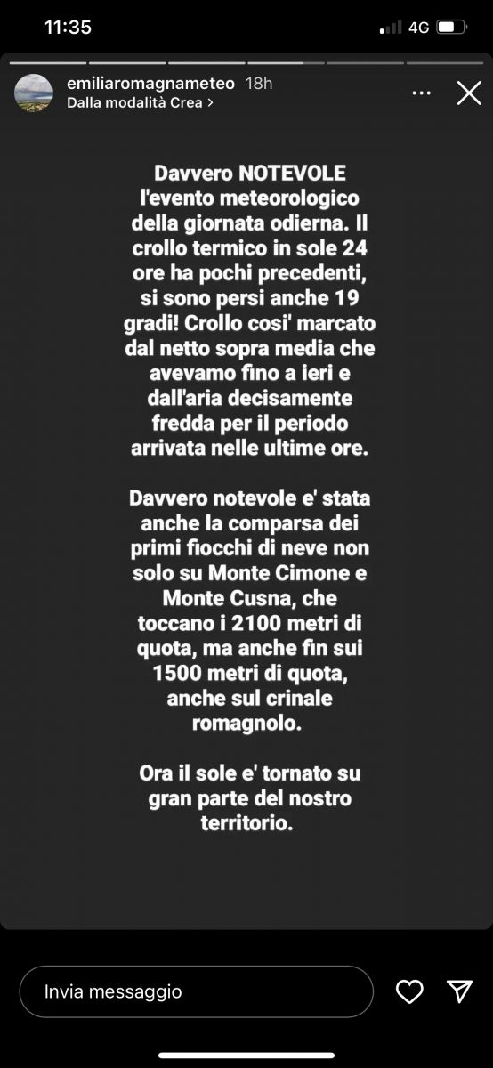 Grazie a queste temperature rigide si sono verificati altri eventi essenziali nel procedere dell’autunno in Emilia-Romagna: la prima neve alle alte quote! In realtà, alte ma non troppo: infatti sul comprensorio del Monte Cimone è avvenuta una spolverata di neve fino a 1600-1700 metri e in Romagna sono stati registrati fiocchi addirittura fino a 1300 metri; prima neve anche sul Monte Cusna. Le montagne dell’Emilia-Romagna sono quindi state le prime di tutta Italia a registrare nevicate così in basso come altitudine per la stagione (eravamo ancora in Estate Astronomica tra l’altro)!! Davvero eccezionale.