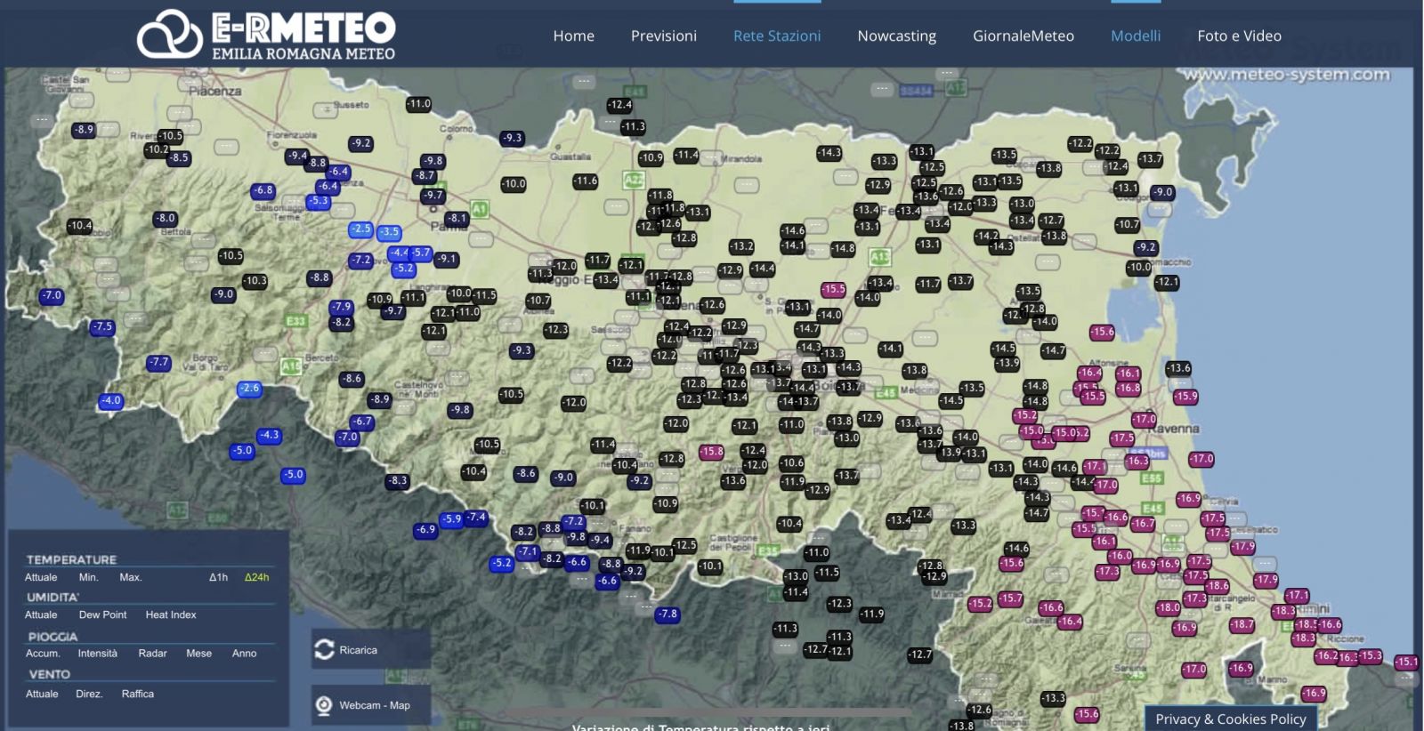 Ecco poi una mappa del calo termico rispetto a 24 ore prima nel corso del pomeriggio su tutta la regione: picchi di 18/19 gradi in meno sulla Romagna!!