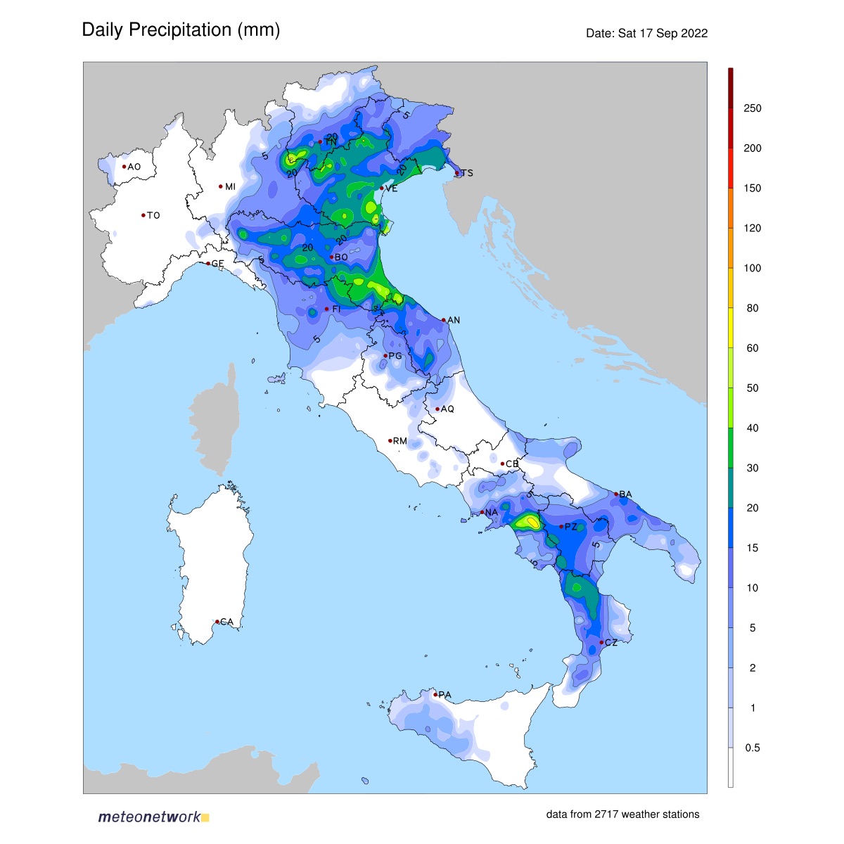 Ed ecco infine le piogge totali registrate in Italia sempre nella giornata in questione (mappa meteonetwork):