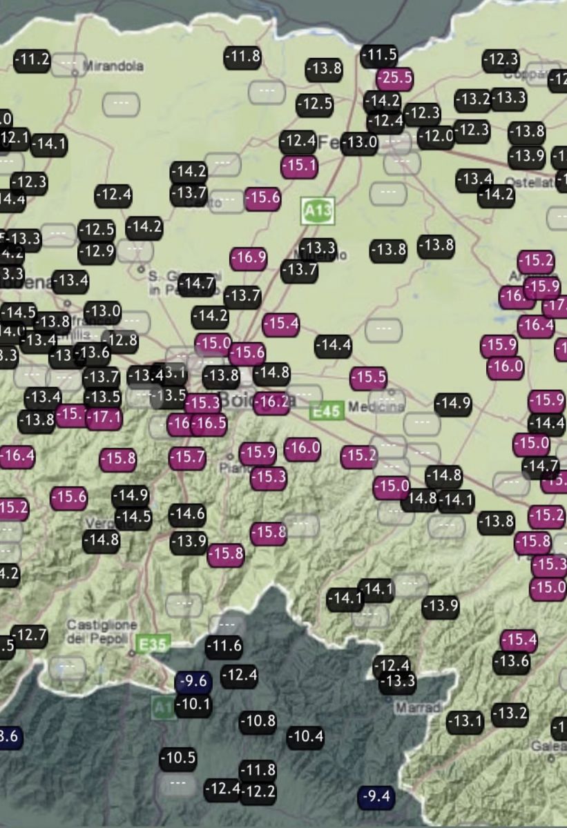 Emilia-Romagna e Veneto in pole position! E la mappa delle temperature minime in Emilia-Romagna il medesimo giorno: