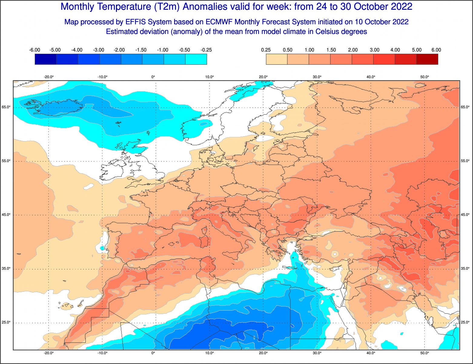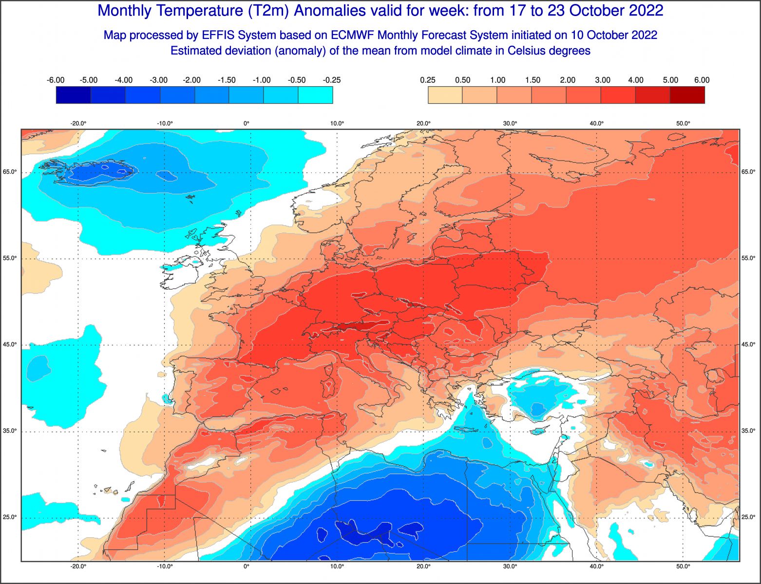 Come si vede molto chiaramente, anche la settimana prima della festa di Halloween sarà caratterizzata da anomalie termiche modestamente positive: ovunque si registreranno valori tra 1 e 2 gradi sopra media. Tuttavia, c’è da dire che sarà meno caldo che a metà mese, viste le anomalie pazzesche previste per quest’ultimo periodo citato: