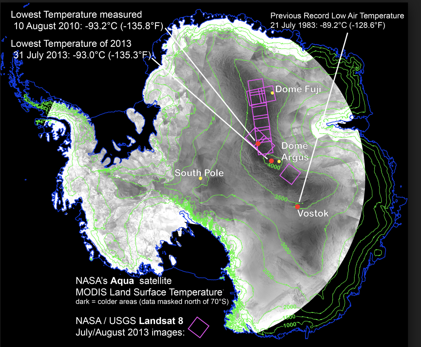 Il polo del freddo al Polo Sud del freddo è la base Vostok (in russo: ??????? ??????, Stancija Vostok, letteralmente "stazione est"), che il 1º luglio 2017 ha fatto registrare la temperatura di -91,8 °C. Ma la temperatura più bassa venne registrata tra Dome Argus(il rilievo più alto dell'Altopiano Antartico , 4000m) e Dome Fuji, nel 2010 dalla NASA: -93.2 °C.