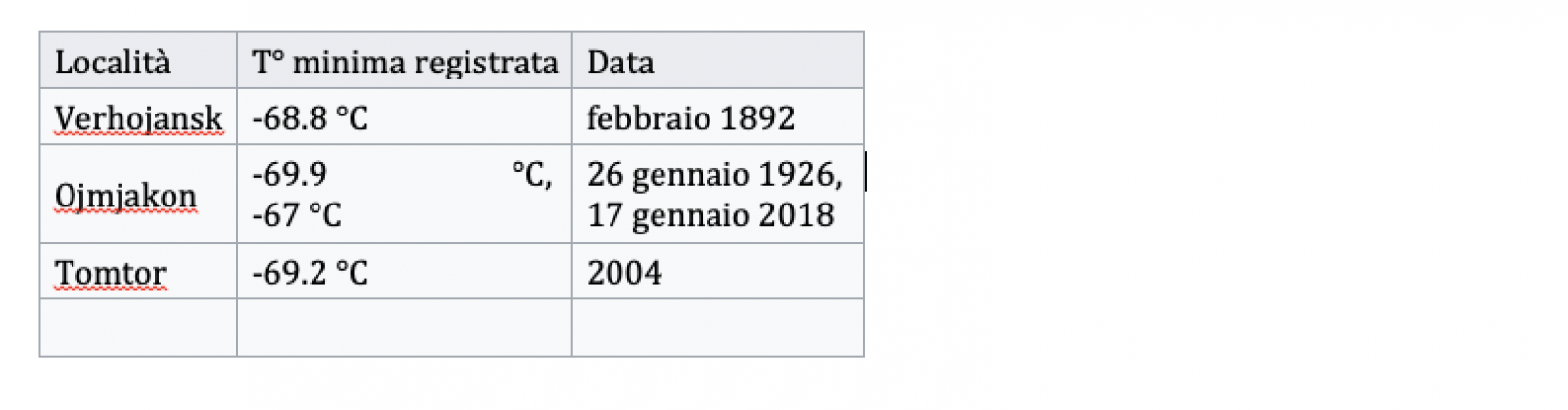 Il primato di Polo Nord del freddo invece è conteso da tre località siberiane: Ojmjakon, Verchojansk e Tomtor: il primo sembrerebbe essere il luogo abitato più freddo della Terra, in quanto alcune fonti riportano un valore minimo di -83 °C nel 1916, tuttavia non è un dato ufficiale. Altre fonti affermano che la temperatura minima del villaggio sia di -69,9 °C. Gli altri due invece hanno fatto registrare temperature lievemente meno fredde: il record di Verchojansk si colloca a -68,8 °C mentre quello di Tomtor a -69,2 °C. La temperatura media minima a gennaio di Verhojansk è di -52 °C.