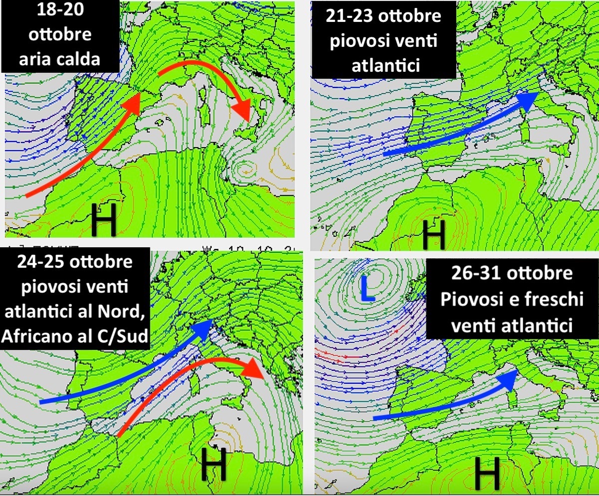 Inizialmente dal 18 al 24ottobre, sull’Italia si alterneranno brevi incursioni atlantiche con correnti calde subtropicali atlantiche, sospinte fino all’Italia dall’anticiclone africano. Ma poi negli ultimi giorni del mese un vastissimo vortice atlantico in avvicinamento all’Europa Occidentale potrebbe portare un lungo periodo di piogge, con le temperature che finalmente rientreranno nella media