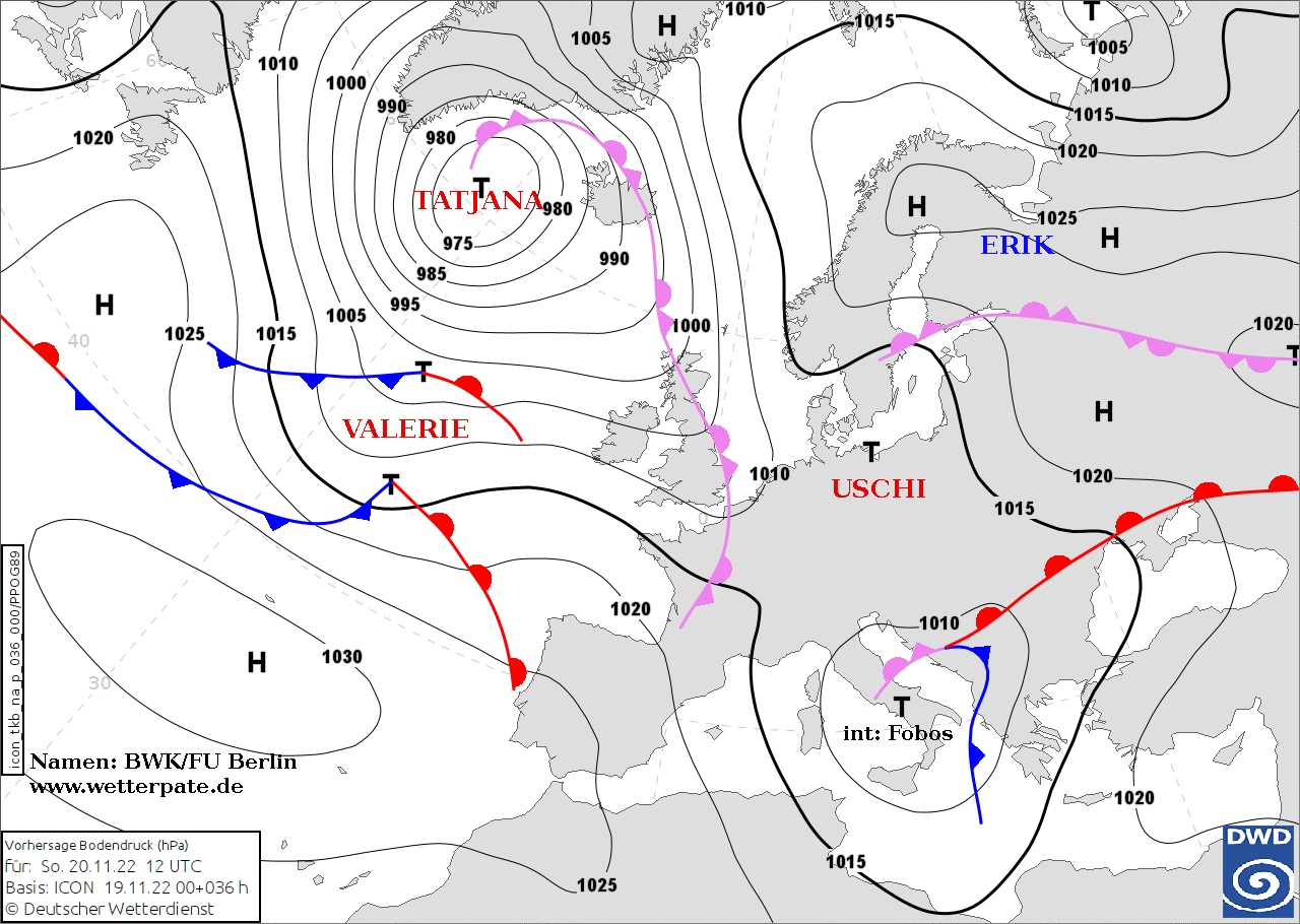 Il fronte perturbato che in queste ore ancora insiste sulla nostra regione va allontanandosi verso sud-est come possiamo apprezzare sulla cartina (analisi al suolo) prevista per le ore centrali di domenica 20 novembre. Tuttavia la circolazione rimarrà depressionaria con il minimo barico che tenderà lentamente a colmarsi nel corso della giornata.