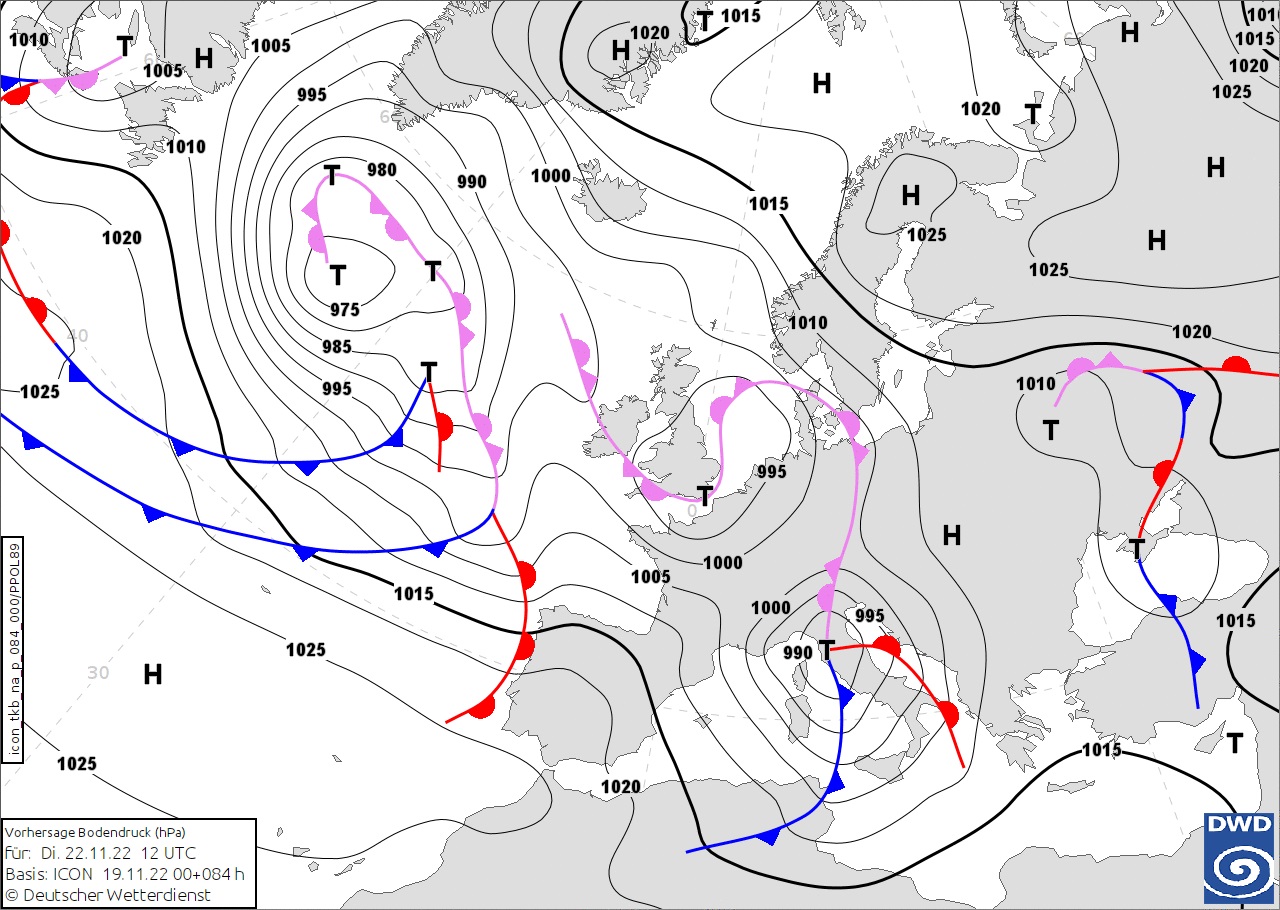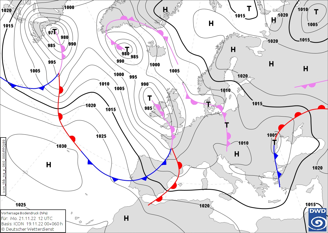 Lunedì 21 un flebile cuneo di alta pressione garantirà un temporaneo miglioramento (vedere successiva cartina); il fronte perturbato avrà ormai raggiunto la Turchia ma una nuova ed intensa perturbazione avanzerà di gran carriera dall'Atlantico; la sua parte più avanzata la ritroveremo sulle Baleari (fronte caldo) ed entro la serata raggiungerà il nord-ovest della nostra penisola; sarà seguita da aria relativamente fredda la quale darà vita ad un profondo minimo depressionario al suolo che dal Tirreno settentrionale si muoverà verso est-sud-est. Depressione che - nelle ore successive - richiamerà intense correnti di Ostro e Libeccio che interesseranno l'intera penisola, mostrandosi più attive lungo il versante tirrenico.