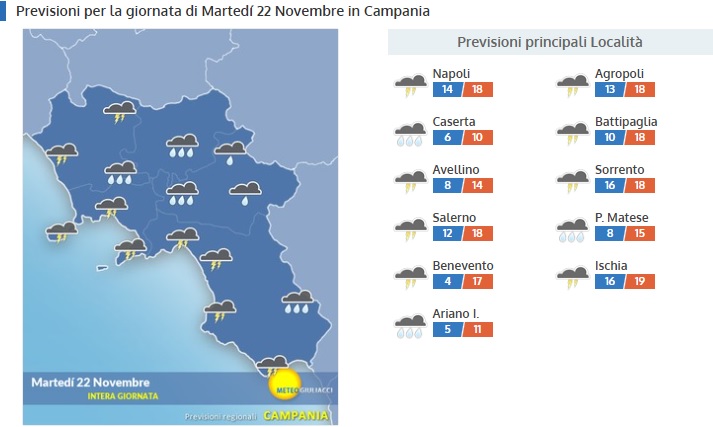 Domenica 20 novembre: al mattino cielo molto nuvoloso con precipitazioni a prevalente carattere di rovescio le quali, sebbene saranno distribuite in maniera irregolare, potrebbero assumere carattere di forte intensità segnatamente sul basso Cilento. Nel corso del pomeriggio ampie schiarite interesseranno il settore centro-settentrionale della regione in estensione alle rimaneti aree entro la serata.