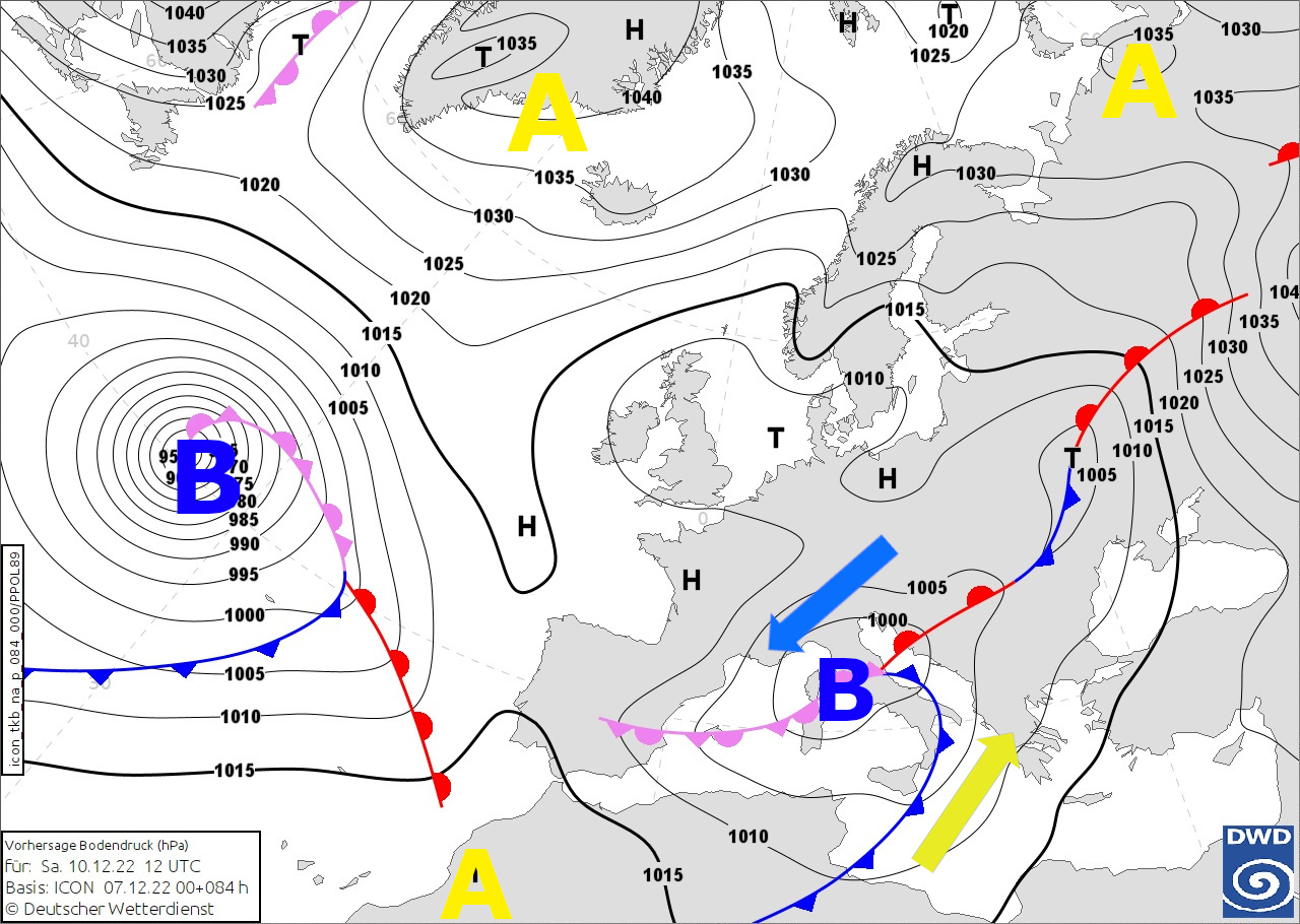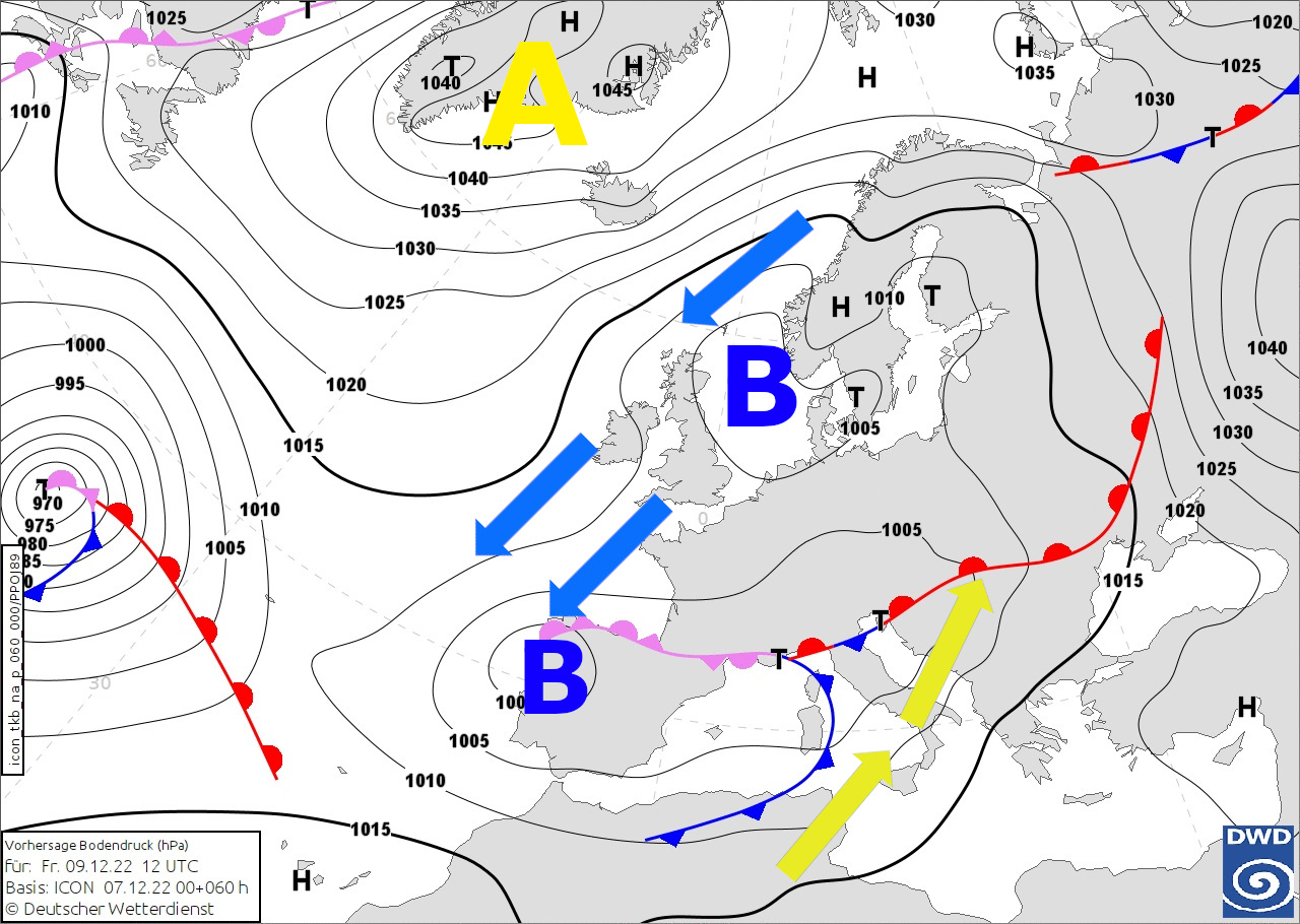 Sulla cartina in basso, prevista per le ore centrali di venerdì 9 dicembre, possiamo apprezzare l'ampia circolazione depressionaria posizionata sulla penisola iberica con annesso fronte perturbato molto complesso. Da notare come le correnti ruotando intorno al minimo di pressione trasporteranno aria fredda sul nord della nostra penisola mentre aria molto mite sulle nostre regioni meridionali e parte di quelle centrali.