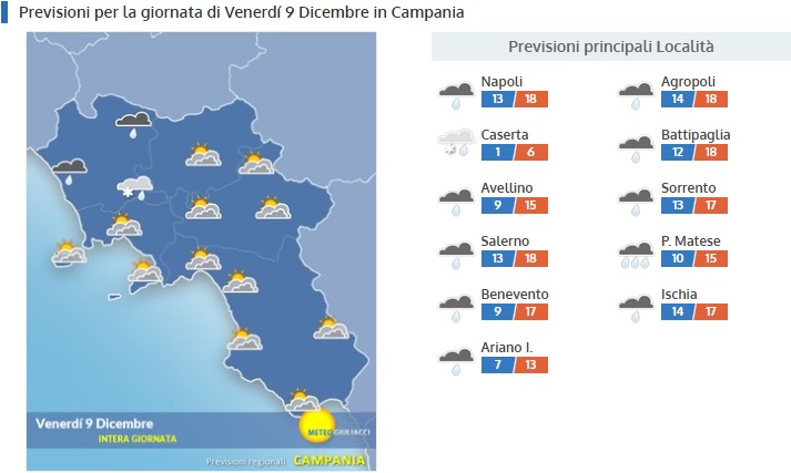 Venerdì 9 dicembre: cielo da nuvoloso a molto nuvoloso sul settore settentrionale con rovesci sparsi; meno diffusa la nuvolosità sulle aree centro-meridionali ma con tendenza ad aumento della copertura dal pomeriggio con possibilità di qualche isolata e debole precipitazione.