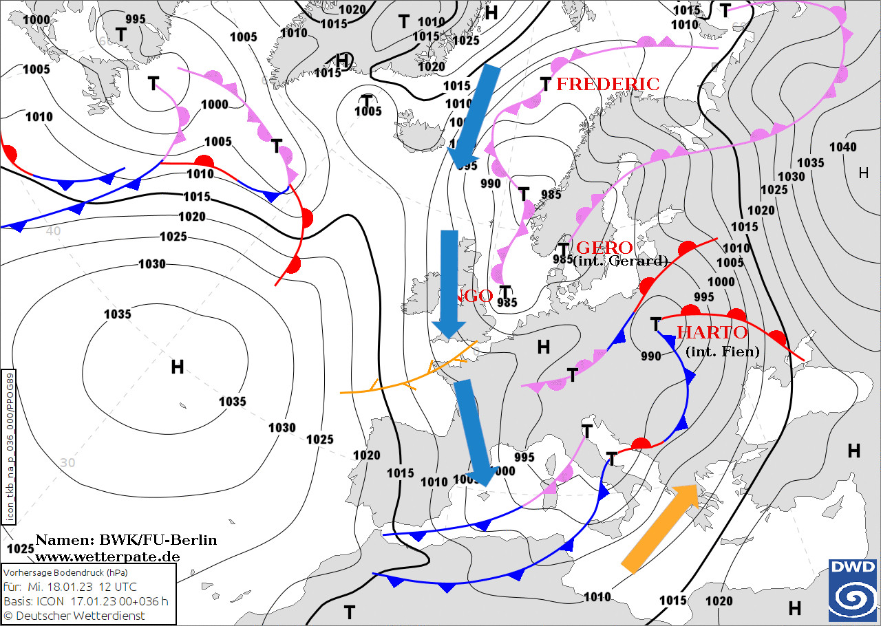 Accumuli oltre i 150 mm di pioggia nell'arco delle ultime 24 ore sono stati registrati tra l'agro-nocerino e l'irpina occidentale mentre apporti superiori ai 100 mm nel basso Cilento. Sono gli effetti del passaggio della forte perturbazione associata alla profonda depressione colma di aria fredda in quota di origine polare. Perturbazione preceduta da intensi venti di libeccio (sud-ovest) che impattando sul settore occidentale dei principali contrafforti montuosi hanno esaltato la fenomenologia. Osservando la cartina in basso (analisi al suolo prevista per le ore centrali di mercoledì 18 gennaio) possiamo notare come la curvatura delle isobare tenderà stringersi sul bacino del Mediterraneo e questo favorirà un'entrata più diretta delle correnti di origine polare; dunque non più un giro largo con rientro da sud-ovest dalla penisola iberica bensì una disposizione più occidentale con conseguente entrata di aria via via sempre più fredda. Freddo che - sulla nostra regione - inizierà a manifestarsi in maniera netta dalla serata di giovedì in un contesto di tempo instabile.