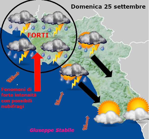 Domenica 25 settembre: cielo da nuvoloso a molto nuvoloso ad iniziare dal settore nord-occidentale della regione con precipitazioni che interesseranno segnatamente le aree comprese tra il casertano, l'alto napoletano ed il sannio nord-occidentale. Su queste aree le precipitazioni potrebbero assumere carattere di forte intensità con temporali autorigeneranti. Sul settore centrale della regione i fenomeni risulteranno meno intensi ed intervallati da schiarite anche se tra la tarda mattinata ed il primo pomeriggio non si esclude la possibilità di qualche temporale anche di forte intensità. Più a sud il rischio di precipitazioni sarà molto basso, al più potrebbe verificarsi qualche piovasco sparso segnatamente sul versante occidentale dell'appennino. Nel corso della serata i fenomeni tenderanno a progredire verso sud ed entro la nottata interesseranno gran parte della regione. Ma sarà nella giornata di lunedì che avremo piogge e temporali ovunque con possibilità di nubifragi tra la Piana del Sele, l'irpinia e l'alto salernitano (ne riparleremo).