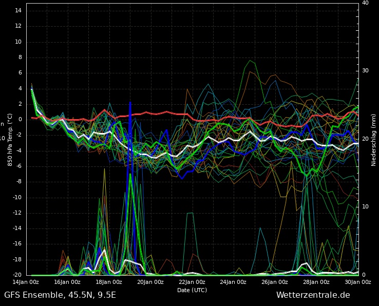 Allo stato attuale dell'arte, questa fase meteo fredda potrebbe durare parecchio: non ci sono infatti i presupposti per il ritorno di mitezza a tempo breve. Nell'immagine allegata notiamo che c'è una linea rossa (che è la media) e un'altra bianca in grassetto che va spesso sotto. Essa è la previsione ENSEMBLE: senza entrare troppo nei dettagli, se c'è una lunga fase meteo sotto media allora la linea bianca sta molto (e a lungo) sotto la rossa. E così sarà.