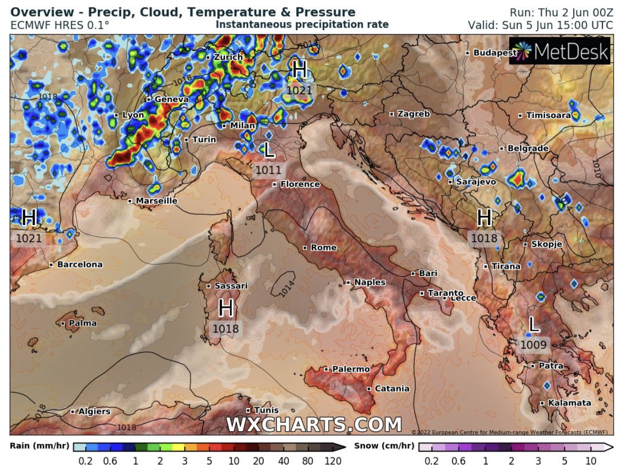C’è poco o niente da dire per quanto riguarda le piogge durante le prossime giornate di Sabato e Domenica: secondo il modello previsionale ECMWF, infatti, entrambe le giornate passeranno in condizioni completamente asciutte, salvo eventuali temporali di calore Domenica pomeriggio al Nord e sulle Alpi specialmente, i quali saranno seguiti da una perturbazione sulle medesime zone nella notte su Lunedì.