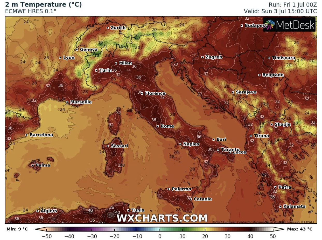 Poche le novità dal punto di vista termico: come in questi giorni, continuerà a fare caldo, decisamente caldo, con valori piuttosto superiori alle medie su tutta Italia. Il caldo africano ancora non intende mollare la presa e farà sudare la popolazione ancora per qualche giorno!