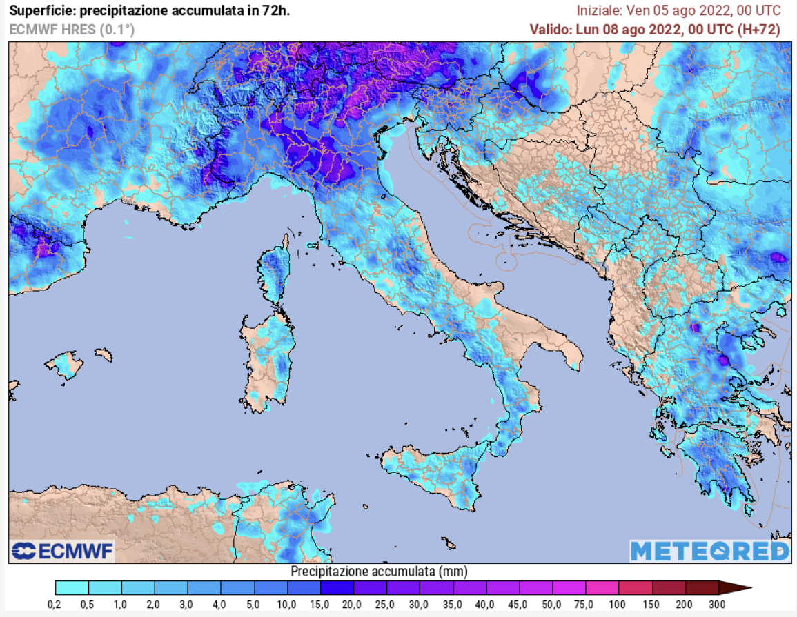 Giungendo alle precipitazioni, novità interessanti anche da questo punto di vista: Sabato avremo alcuni piovaschi sulle regioni Meridionali Tirreniche e al Settentrione, ma si tratterà prevalentemente di fenomeni deboli e localizzati. Procedendo, nella giornata di Domenica registreremo fenomeni temporaleschi molto intensi e diffusi in quasi tutta la Val Padana; nel corso della giornata essi stazioneranno su alcune parti del Nord e si sposteranno anche su parte del Centro e del Sud Tirrenico, Isole Maggiori incluse. Ecco la mappa delle precipitazioni totali previste fino alla notte tra Domenica e Lunedì dal modello meteorologico ECMWF (è inclusa parte della giornata di Venerdì):