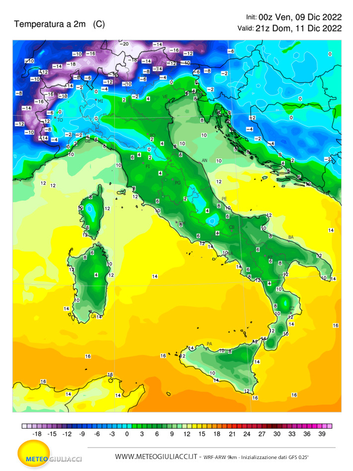 Sabato sarà una giornata ancora caratterizzata da un modesto sopra-media termico, dovuto agli effetti della rimonta calda di oggi, che continuerà domani; tuttavia le termiche caleranno leggermente. A partire da Domenica e dal Nord del nostro paese giungerà sulla nostra nazione aria fredda di origine polare, la quale apporterà la prima ufficiale ondata di freddo in Italia! Le temperature caleranno di vari gradi sotto alle medie della stagione e gli effetti saranno visibili soprattutto al Centro-Nord, ma anche il Sud assisterà a un drastico caldo termico, più che altro per le temperature notevolmente elevate dei giorni precedenti. In Sicilia bisognerà invece attendere l’inizio della settimana per l’afflusso di aria fredda.