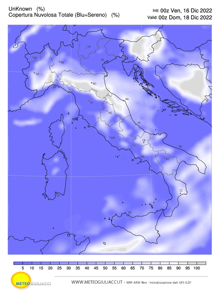 Veniamo ora alle precipitazioni: la giornata di Sabato sarà leggermente perturbata al Centro e al Sud, con piovaschi localizzati e non uniformi, concentrati soprattutto sul versante adriatico del Paese; queste ultime piogge si esauriranno nel corso della mattinata di Domenica, giorno in cui prevarranno condizioni di tempo stabile e asciutto, sebbene caratterizzato dalla presenza di nuvolosità su molte regioni. Ecco in particolare la nuvolosità prevista dal nostro modello per la notte tra Sabato e Domenica: