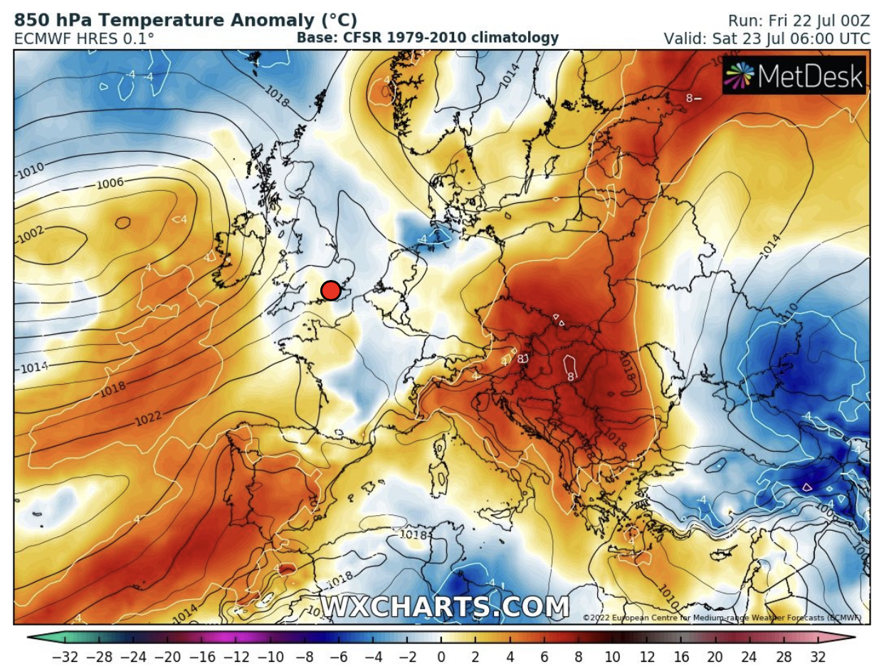 Termicamente parlando, il weekend in arrivo porterà con se un ulteriore aumento delle temperature nella giornata di Sabato. Non sono esclusi valori davvero vicini se non localmente superiori ai +40 gradi su buona parte del paese, specialmente al Centro e al Nord. La giornata di Domenica potrebbe invece presentare un paio di gradi in meno, ma sempre valori molto elevati. Ecco le anomalie termiche previste per il weekend rispetto alle medie climatiche a 850 hPa di quota: