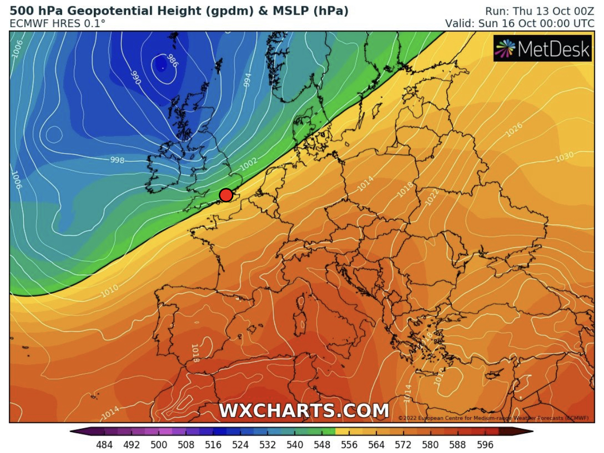 Termicamente parlando, il weekend presenterà un aumento termico sensibile, dapprima al Centro-Nord e poi anche al Centro-Sud, sebbene l’estremo Sud resterà interessato da temperature in media stagionale o addirittura al di sotto, mentre altrove si salirà su valori molto superiori alla norma: si tratterà di una ondata di calore (molto) tardiva! Ottobrata dunque a oltranza sulle nostre regioni del Nord. Ecco l’altezza prevista del geopotenziale in Europa per le ore centrali del prossimo fine settimana: