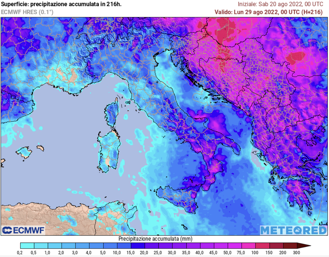 Ecco la mappa delle precipitazioni totali previste in Italia per la nuova settimana dal modello meteorologico ECMWF (attenzione: sono incluse parte della giornata di Sabato, oggi, e parte della giornata di Domenica):