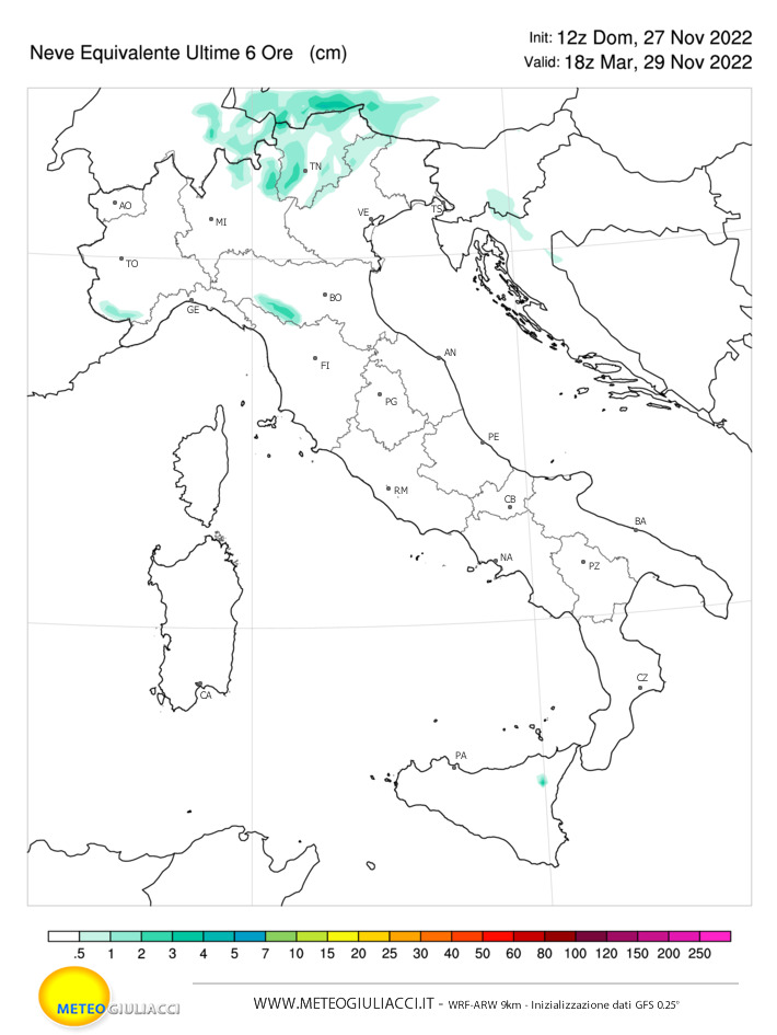 Unitamente al freddo e alle precipitazioni, avremo a che fare con nevicate a quote interessanti; nella prima parte della settimana la neve potrebbe cadere su tutto l’arco alpino e nordappenninico a quote medio-alte, indicativamente sopra i 1000 metri; anche sull’Appennino centro-meridionale è prevista neve, a quote elevate. Invece, tra Venerdì e Sabato, oltre che nevicare nuovamente sulle Alpi si potrebbero avere le prime nevicate a quote medie in Basso Piemonte, fin sotto i 500 metri e abbondanti! Ecco le precipitazioni nevose previste per Martedì dal nostro modello: