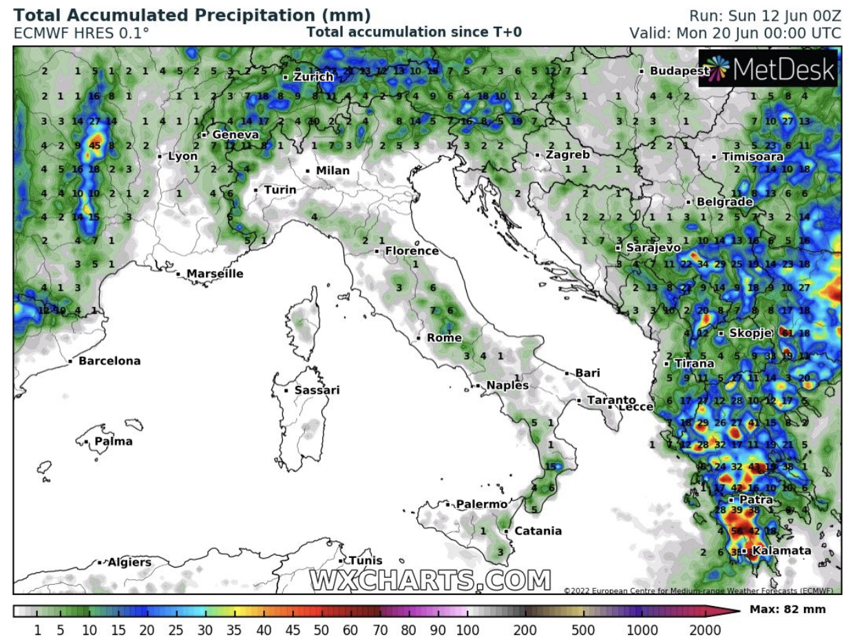 Termicamente palando, l’intera settimana si svilupperà secondo una sinottica ben precisa: temperature moderatamente superiori alle medie stagioni al Centro-Nord e in Sardegna e leggermente superiori alle medie al Centro-Sud e in Sicilia, con afflusso freschi più frequenti e probabili soltanto all’estremo Sud. Settimana centrale del mese che sarà quindi caratterizzata da temperature tipicamente Estive su tutta Italia!