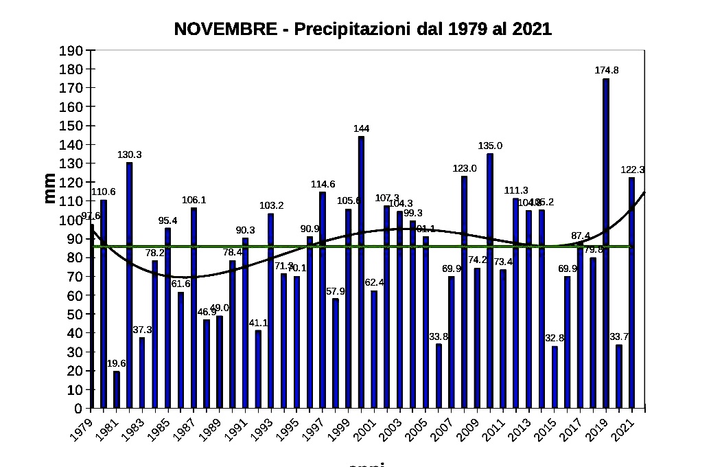 Le medie statistiche pluriennali relative e novembre mostrano due particolarità. La prima: dal 1979 al 2021 vi sono state in novembre 4 annate estremamente siccitose (appena circa 30mm) :1980, 2006,2015,2019. E ‘ evidente l’aumento di probabilità di mese di novembre siccitoso negli ultimi 20 anni. La seconda: è l’aumentata variabilità della piovosità in novembre, un mese nel quale negli ultimi 20 anni si sono spesso alternati mesi di super piovosi con mesi siccitosi. Però rimane l’impressione che novembre potrebbe tradire le piovose attese più che nel passato.
