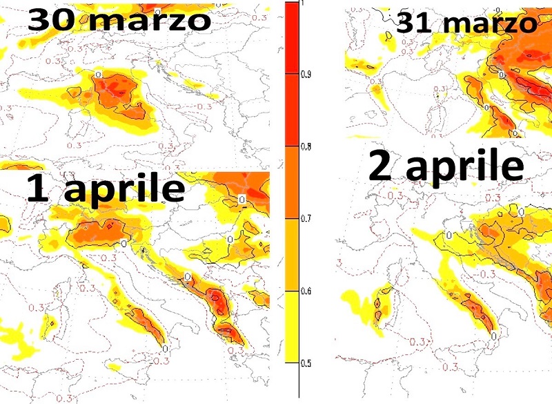 Le piogge interesseranno, dal 30 marzo al 2 aprile, tutta l’Italia e poi, il 3 e 4, in prevalenza il Centro-Sud. Poi dal 5 al 7 aprile torna il bel tempo per merito dell’anticiclone delle Azzorre. Durante la lunga fase piovosa, i venti prevalenti saranno di Libeccio (da sudovest) per cui le regioni ove le piogge saranno abbondanti sono quelle tirreniche, Levante ligure e il Triveneto. Qui gli accumuli previsti raggiungono oltre 100mm.