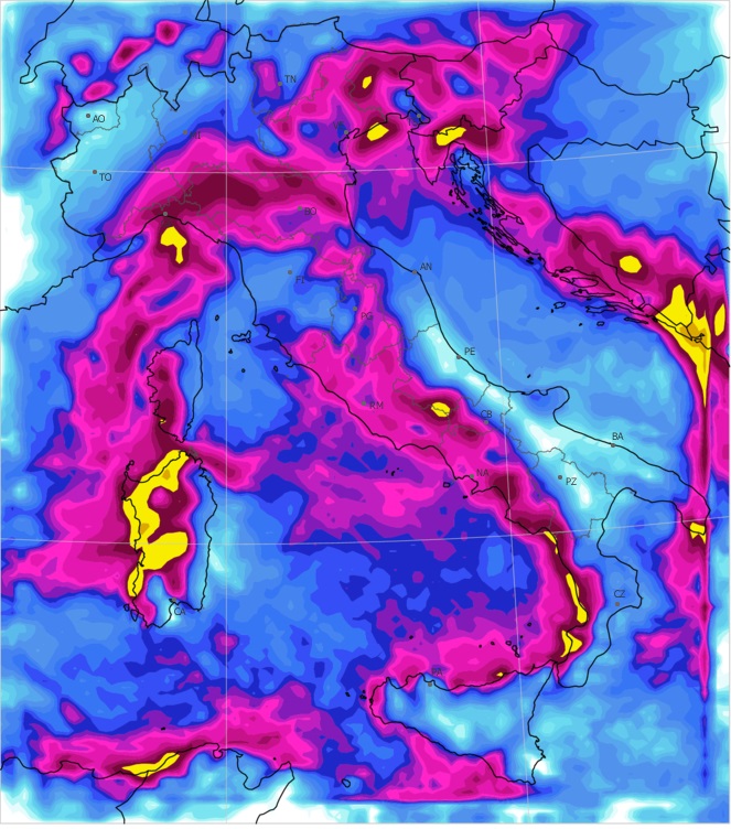 Tante piogge nei prossimi giorni: particolare attenzione alle aree in viola, con valori di 50-80 mm diffusi, ma ben oltre i 100 localmente.