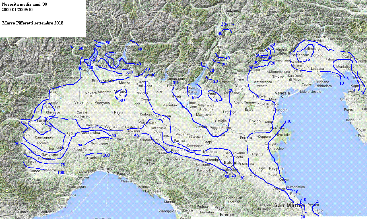 Per scoprire in modo generale a quanto ammontano le medie nivometriche degli anni ‘00 del 2000 in PP (Pianura Padano-Veneta) ci avvaliamo delle mappe curate da Marco Pifferetti, che ringraziamo.