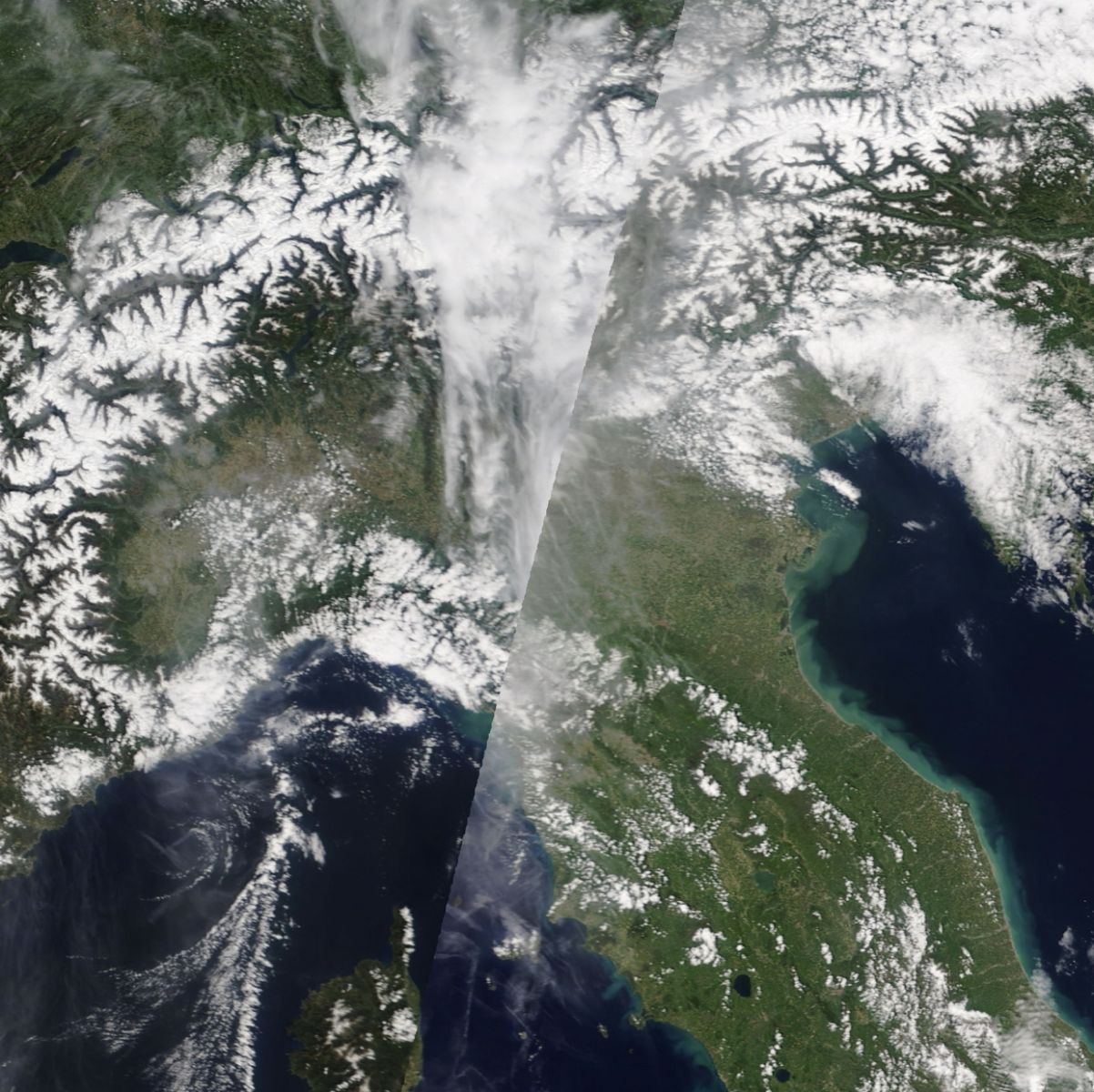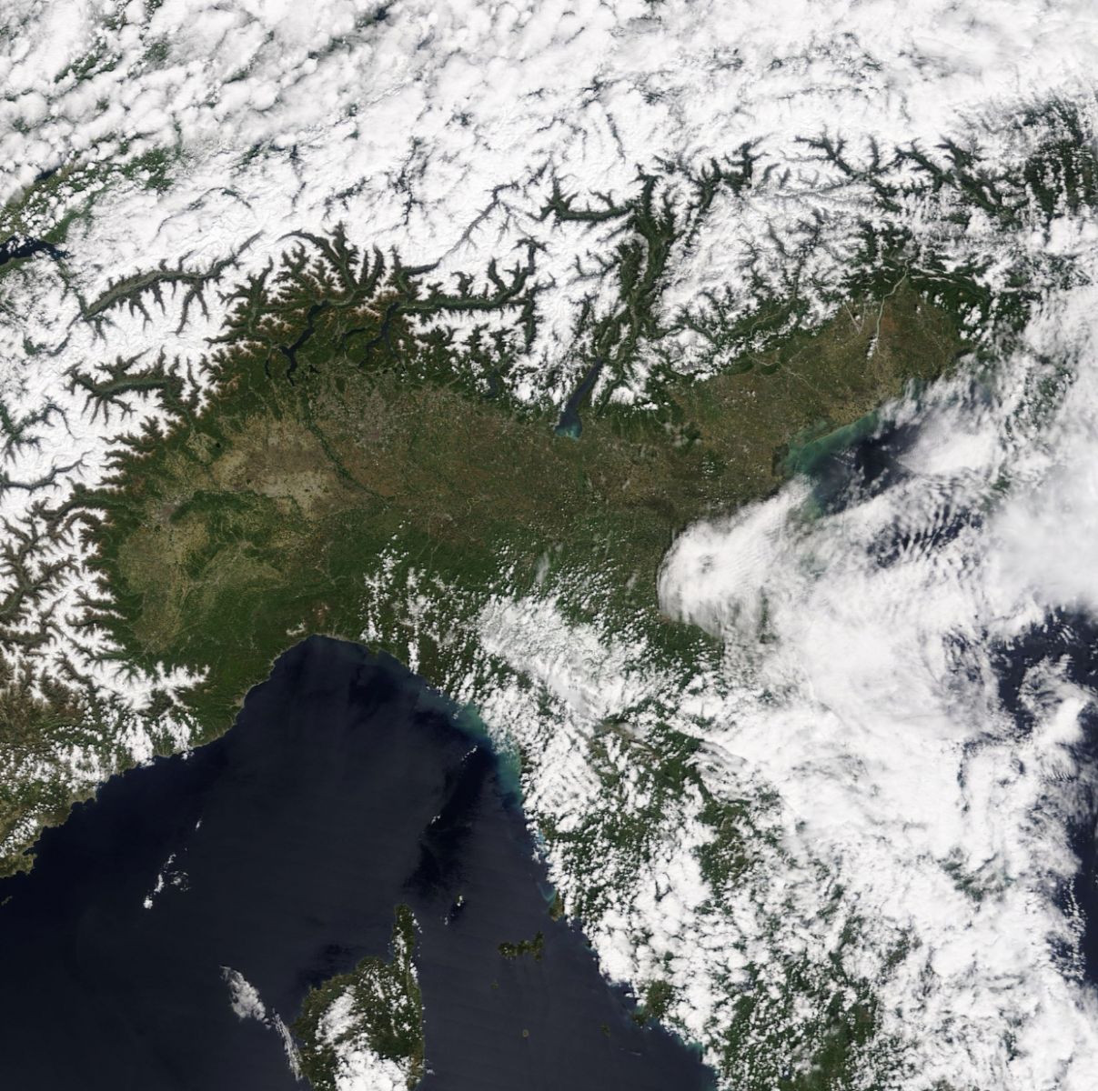 Pertanto è stata riscritta la storia meteo di questa regione in questa mitica giornata di Maggio 2019, con neve che si è spinta persino a quote prossime al livello del mare a meno di un mese dall’inizio dell’Estate meteorologica. Per concludere, vediamo gli effetti di quella pazzesca perturbazione di stampo più invernale che primaverile in questa regione: lo scatto satellitare di Lunedì 6 Maggio lascia intravedere, ma con difficoltà a causa della nuvolosità residua, gli accumuli di neve sull’Appennino Emiliano.