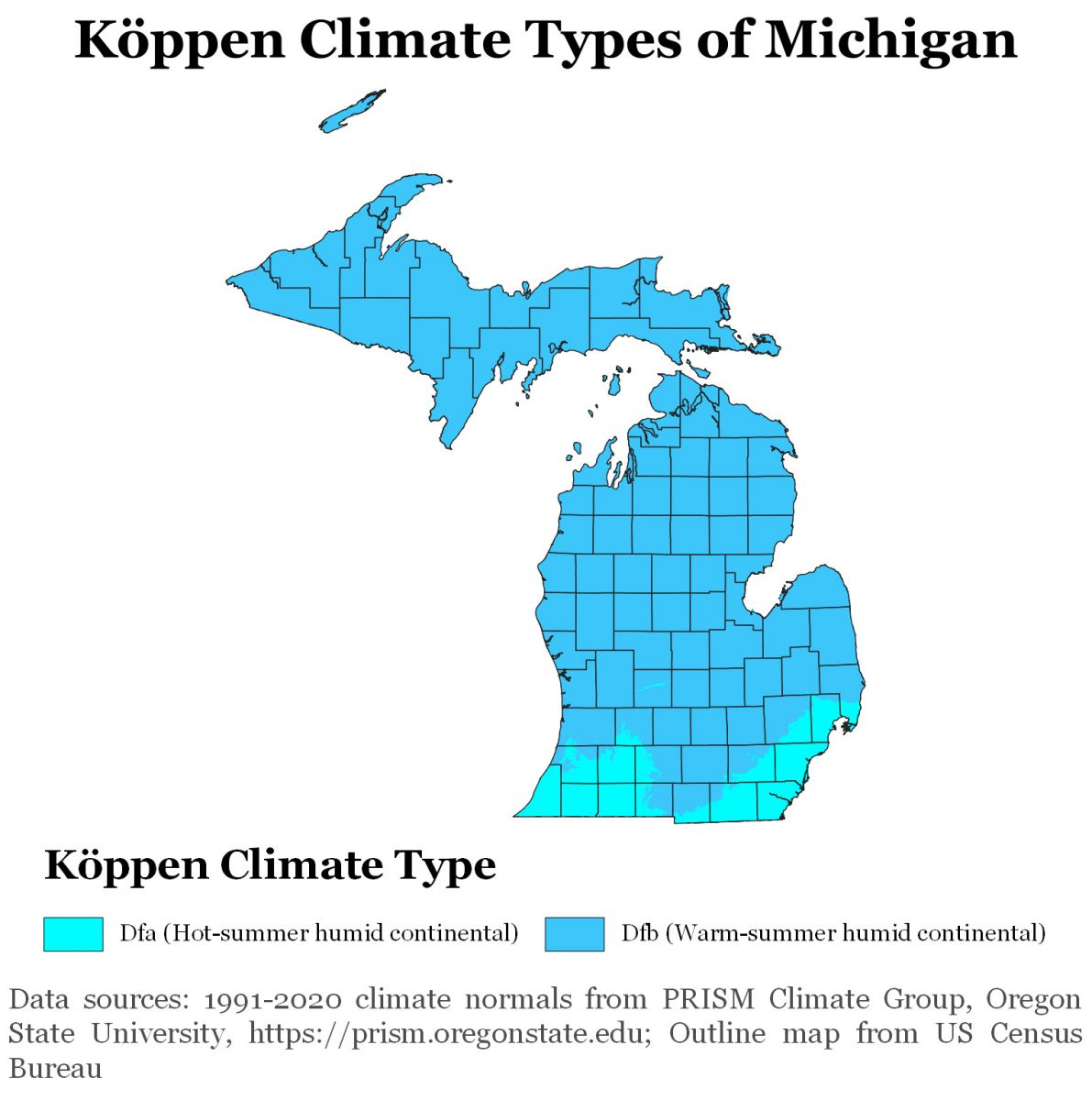 In Michigan due sono i climi dominanti: nella stragrande maggioranza dello stato è presente il “Dfb”, ovverosia il clima continentale ad Estate calda, il quale presenta temperatura media del mese più caldo inferiore a 22°C, precipitazioni costanti tutto l’anno e temperatura media del mese più freddo inferiore a -3°C; nelle zone dove la temperatura media del mese più caldo è superiore a 22°C, nel Sud della penisola inferiore, fa la sua comparsa anche il “Dfa”, clima continentale ad Estate molto calda.