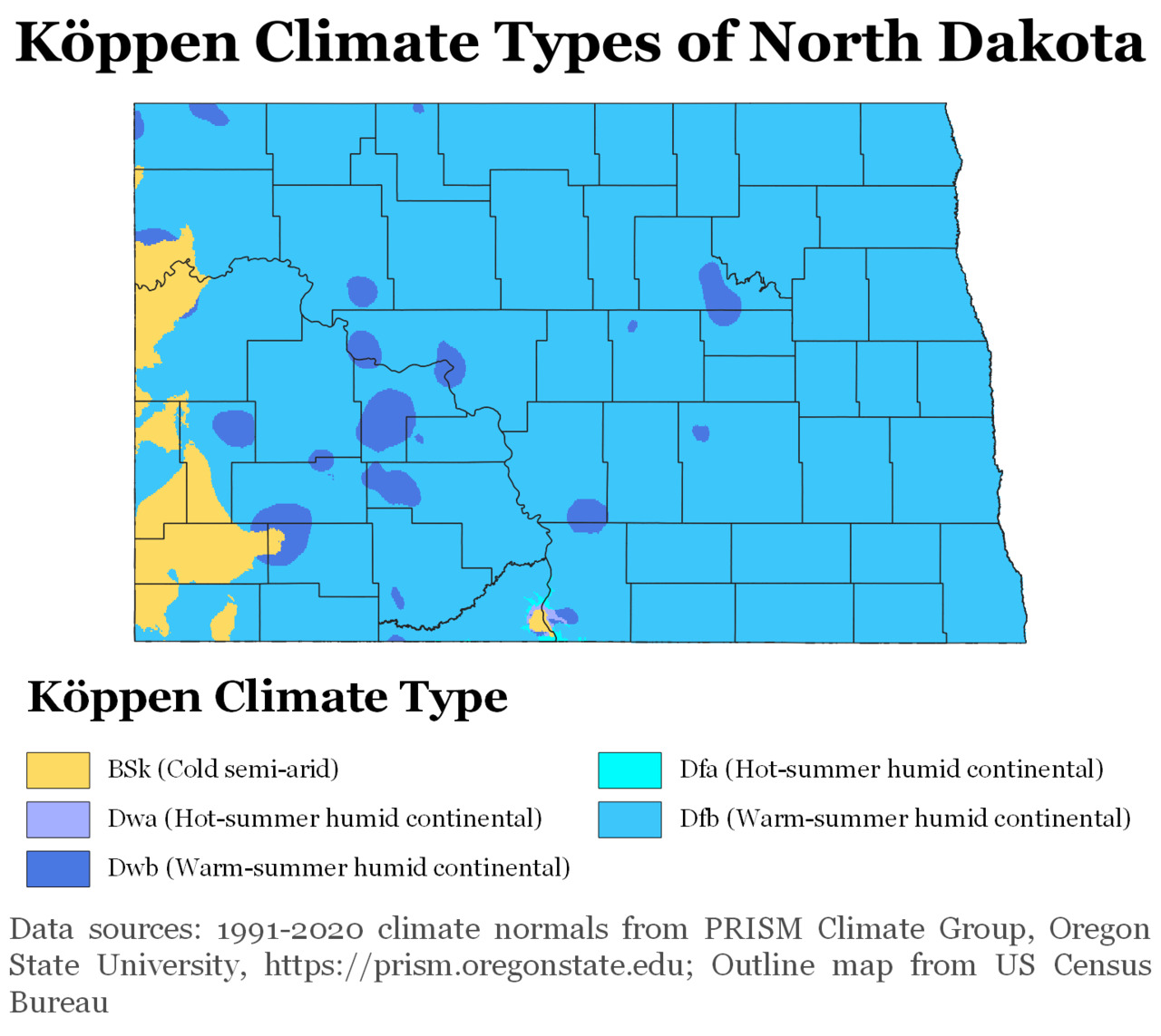 Per concludere, il clima “BSk”, cioè il semi-arido freddo, si trova nelle aree del Nord Dakota dove le precipitazioni sono più scarse, cioè a Ovest, vicino ad alcuni degli stati più secchi della nazione.